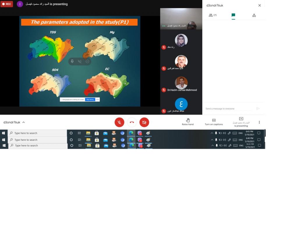 ضمن اطار الحلقات النقاشية في قسم تقانات البيئة القى اليوم الأربعاء ١٩ ايار ٢٠٢١ كل من المدرس رائد محمود فيصل ، المدرس المساعد عبدالله عبد الستار ذنون والمدرس محمد فخر الدين أحمد سيمنار بعنوان”Evaluation the Suitability of Ground Water Quality at Al-Hamdaniya Area Using GIS & MCDM”شعبة الاعلام والعلاقات العامة
