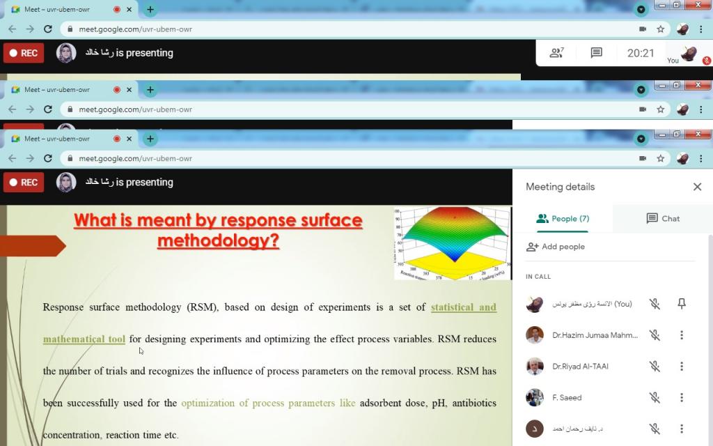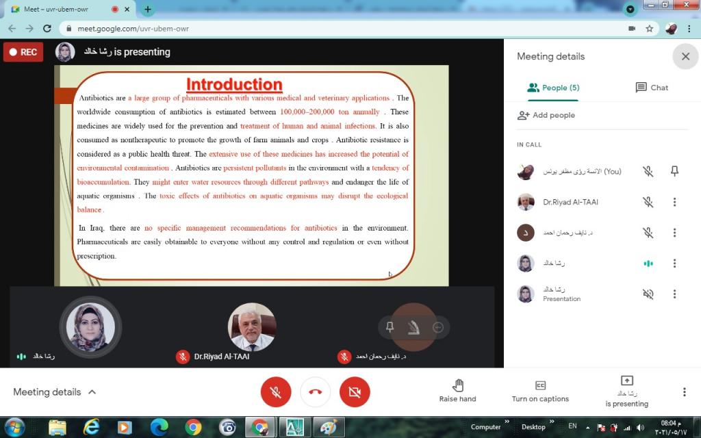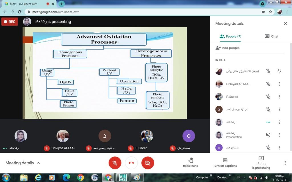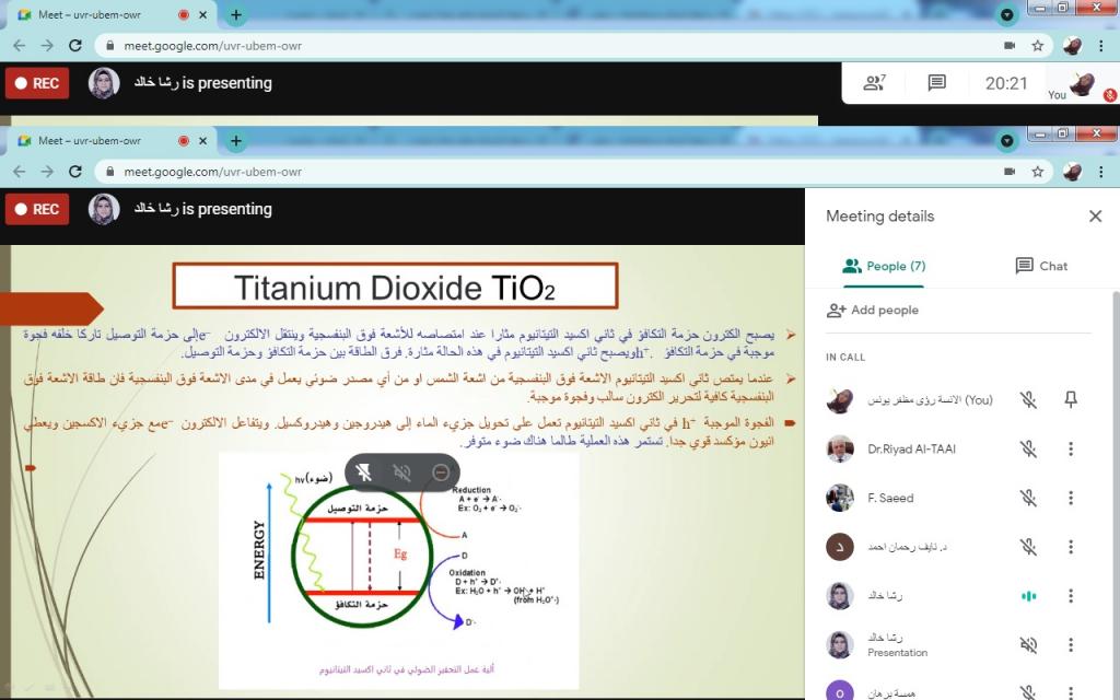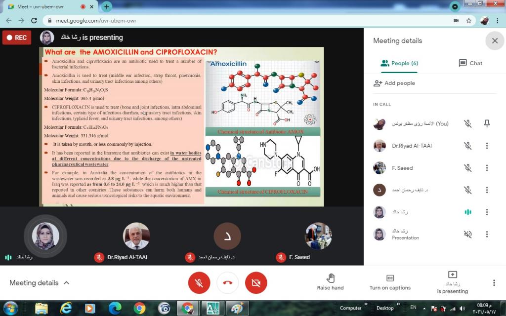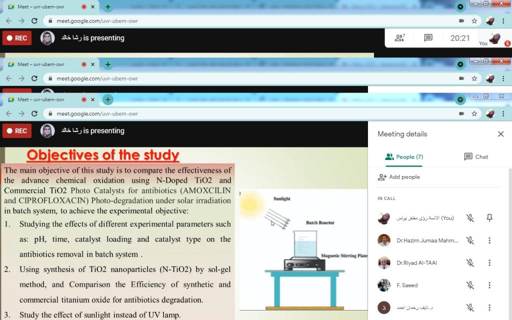 ضمن الخطة العلمية لقسم تقانات البيئة، وبغية تسجيل البحوث العلمية المقترحة للفصل الدراسي الثاني للعام الدراسي 2020/2021 ومناقشتها من قبل اعضاء مجلس القسم، القت الدكتورة رشاد خالد صبري التدريسية في قسم تقانات البيئة سيمنار عن البحث المقترح بعنوانComparing the Efficiency of N-Doped TiO2 and Commercial TiO2 as Photo Catalysts for Amoxicillin and Ciprofloxacin Photo-degradation under solar irradiation.هدفت الدراسة الى مقارنة فعالية الأكسدة الكيميائية المتقدمة باستخدام N-Doped TiO2 ومحفزات TiO2 التجارية للمضادات الحيوية (AMOXCILIN و CIPROFLOXACIN) وكذلك دراسة تأثيرات المتغيرات التجريبية المختلفة مثل الرقم الهيدروجيني والوقت وتحميل المحفز ونوع المحفز في إزالة المضادات الحيوية في نظام الدفع باستخدام تخليق جزيئات TiO2 النانوية (N-TiO2) بطريقة sol-gel ، ومقارنة كفاءة التركيبات وأكسيد التيتانيوم التجاري لتحلل المضادات الحيوية.كما تطرق البحث الى دراسة تأثير ضوء الشمس بدلاً من مصباح الأشعة فوق البنفسجية.شعبة الاعلام والعلاقات العامة