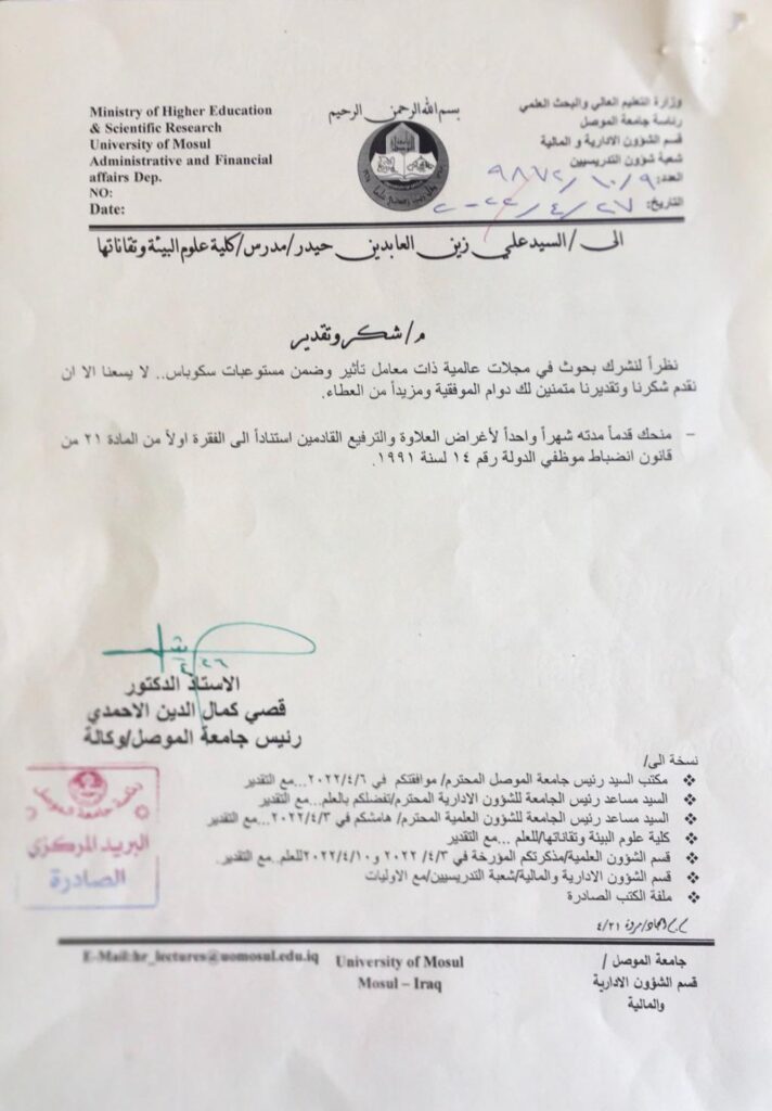 بمناسبة عيد الفطر المبارك تتقدم عمادة كلية علوم البيئة وتقاناتها متمثلة بالسيدة عميد الكلية الأستاذ المساعد الدكتورة يسرى مجيد الشاكر بخالص التهاني والتبريكاتالى السيد رئيس جامعة الموصل الاستاذ الدكتور قصي كمال الدين الاحمدي والسادة اعضاء مجلس الجامعة وجميع كوادر ومنتسبي جامعتنا والطلبة الاعزاء , اعاده الله علينا وعلى عراقنا الحبيب ومدينتنا العزيزة والامة الاسلامية بالخير واليمن والبركاتشعبة الاعلام والعلاقات العامة
