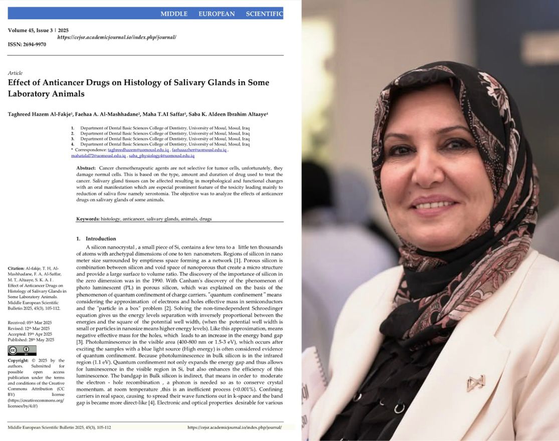 وجاء البحث بعنوان “تأثير الأدوية المضادة للسرطان على أنسجة الغدد اللعابية في بعض الحيوانات المختبرية”،