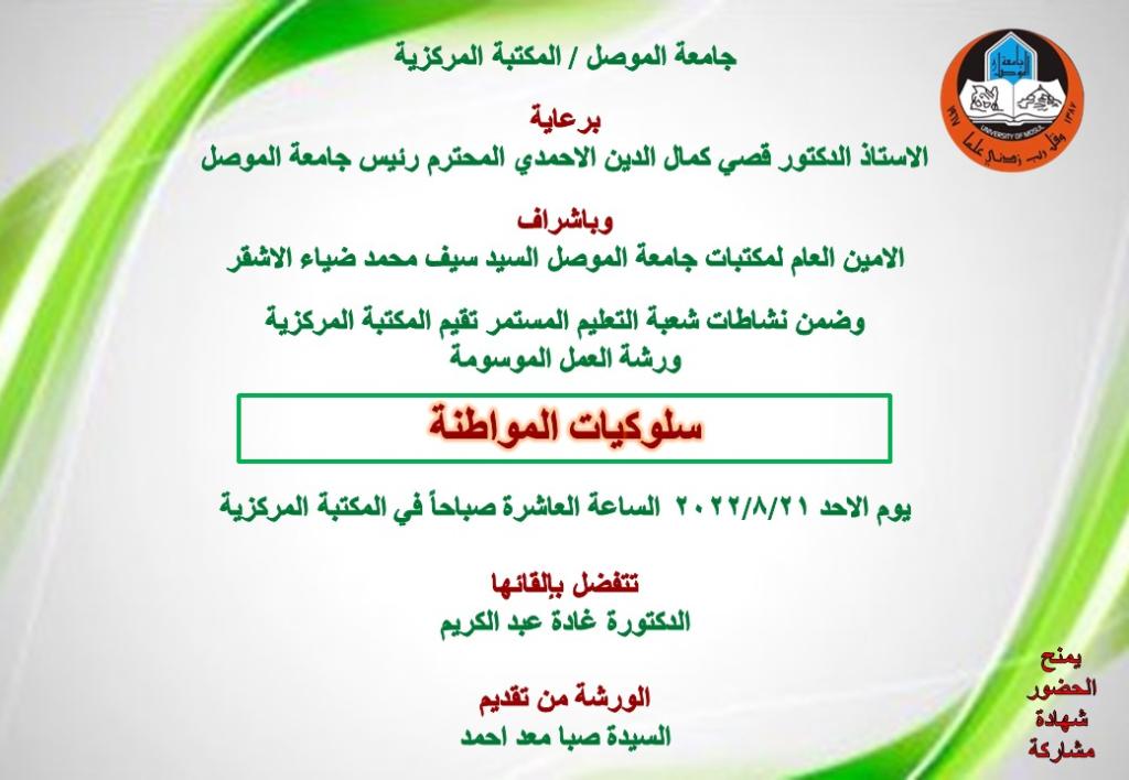 ضمن نشاطات شعبة التعليم المستمر حضرت السيدة نبأ عبدالاله ابراهيم (مسؤولة مكتبة مركز بحوث البيئة) ورشة العمل الموسومة “سلوكيات المواطنة” اليوم الاحد الموافق 21 اب 2022 والتي اقامتها المكتبة المركزية برعاية الاستاذ الدكتور قصي كمال الدين الاحمدي رئيس جامعة الموصل وباشراف الامين العام لمكتبات جامعة الموصل السيد سيف محمد ضياء الاشقر.تضمنت الورشة السلوكيات الصحيحة والوعي الثقافي في استخدام التكنولوجيا الرقمية الحديثة وتوظيفها لخدمة المؤسسات التعليمية وتوفير فرص العمل وتثقيف الاطفال والطلاب لتنشئتهم تنشئة رقمية صحيحة.