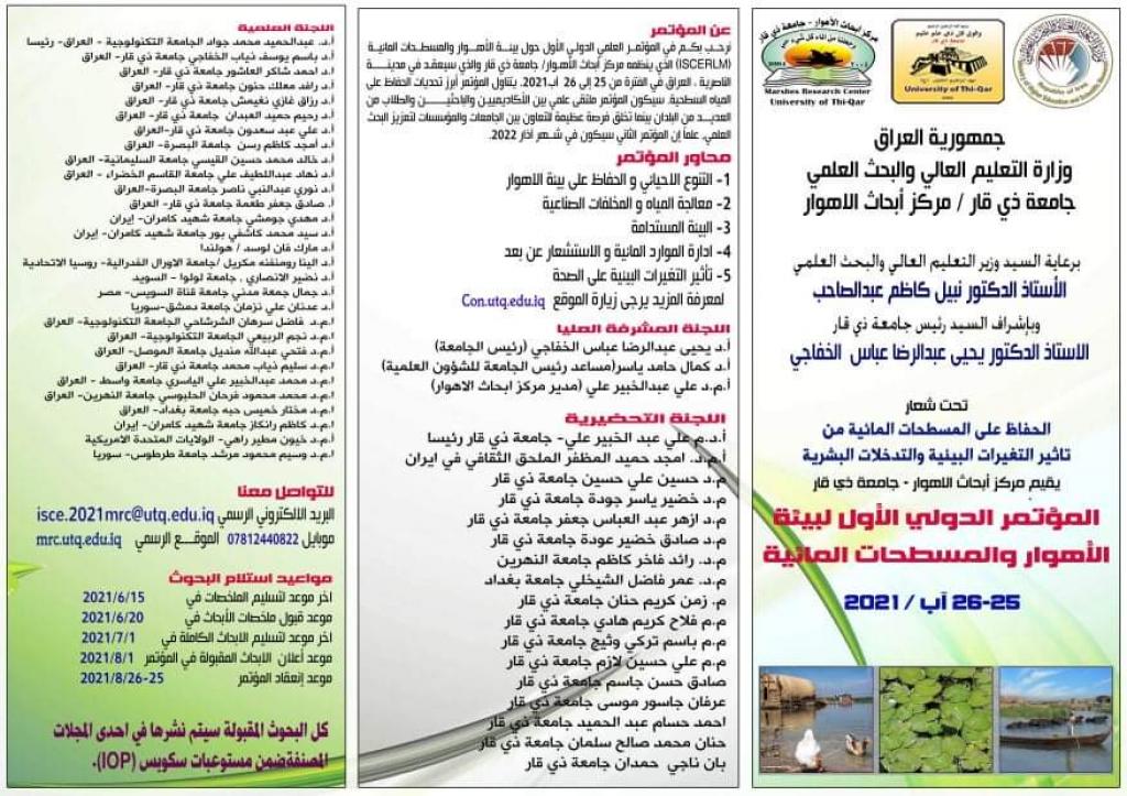 تم اختيار مدير مركز بحوث البيئة الدكتور فتحي عبدالله منديل لعضوية اللجنة العلمية للمؤتمر العلمي الذي سيقيمه مركز ابحاث الاهوار / جامعة ذي قار تحت شعار (الحفاظ على المسطحات المائية من تاثير التغيرات البيئية والتدخلات البشرية) للفترة من 25-26 اب 2021 ، وبهذه المناسبة تدعو ادارة مركز بحوث البيئة / جامعة الموصل المهتمين في مجال البيئة المائية للمشاركة في المؤتمر متمنيةً التوفيق والنجاح للمشاركين والقائمين على اعمال المؤتمر .