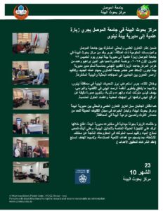 ضمن إطار التعاون العلمي والبحثي المشترك بين جامعة الموصل والمؤسسات الحكومية ذات العلاقة، أجرى وفد من مركز بحوث البيئة في جامعة الموصل زيارة علمية إلى مديرية بيئة نينوى يوم الخميس 23 تشرين الأول 2025، برئاسة الدكتورة صبا خير الدين إبراهيم وعدد من كوادر المركز.