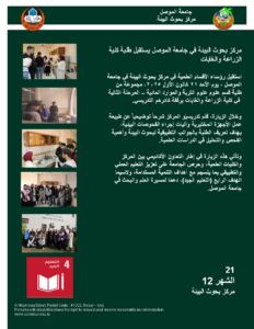 وتأتي هذه الزيارة في إطار التعاون الأكاديمي بين المركز والكليات العلمية، وحرص الجامعة على تعزيز التعليم العملي والتطبيقي بما ينسجم مع أهداف التنمية المستدامة، ولاسيما الهدف الرابع (التعليم الجيد)، دعمًا لمسيرة العلم والبحث في جامعة الموصل.