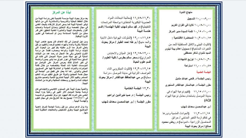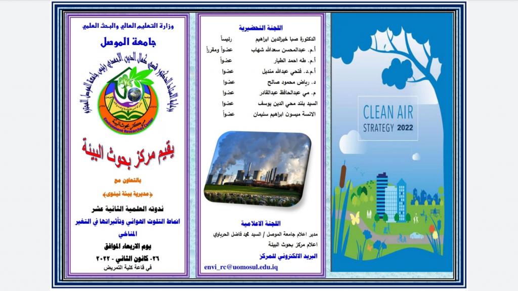 برعاية وحضور السيد رئيس جامعة الموصل الاستاذ الدكتور قصي كمال الدين الاحمدي اقام مركز بحوث البيئة في الجامعة وبالتعاون مع مديرية بيئة نينوى ندوة علمية عن انماط التلوث الهوائي وتأثيراتها في التغير المناخي ، حضرها السيد مساعد رئيس الجامعة للشؤون العلمية الاستاذ الدكتور منير سالم طه وعدد من باحثي المركز ومنتسبين من مديرية البيئة وتدريسيين من ذوي الاختصاص . ناقشت محاضرات الندوة تقييم نوعية الهواء في مدينة الموصل والملوثات الهوائية داخل الابنية والتلوث الميكروبي نتيجة العواصف الترابية وغاز الميثان والاحتباس الحراري فضلاً عن التلوث البيئي والٱفاق المستقبلية للحد من التغيرات المناخية .