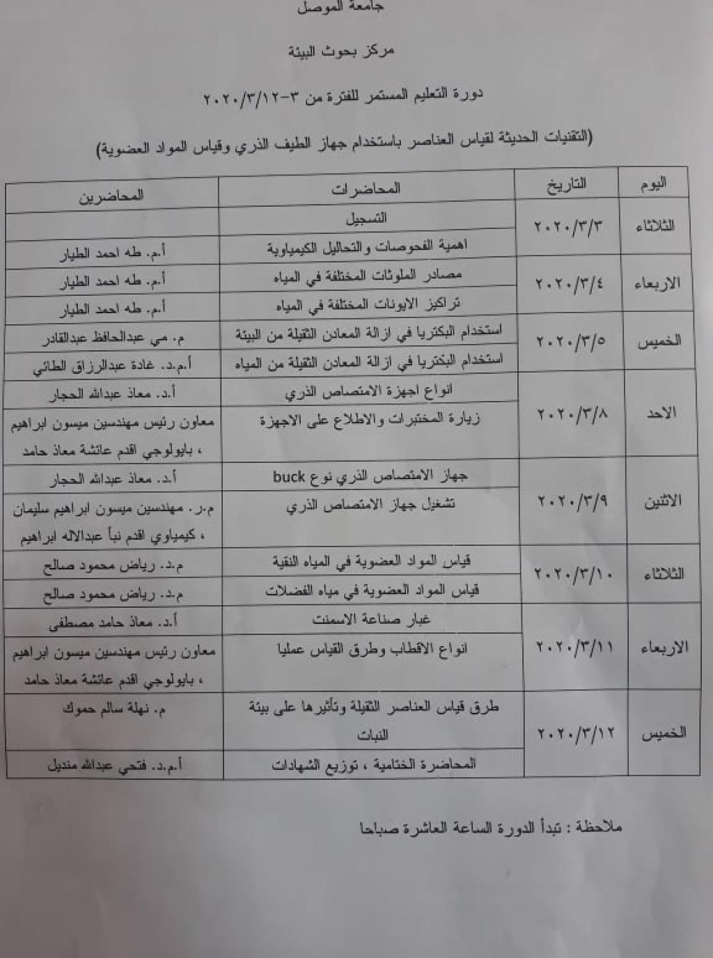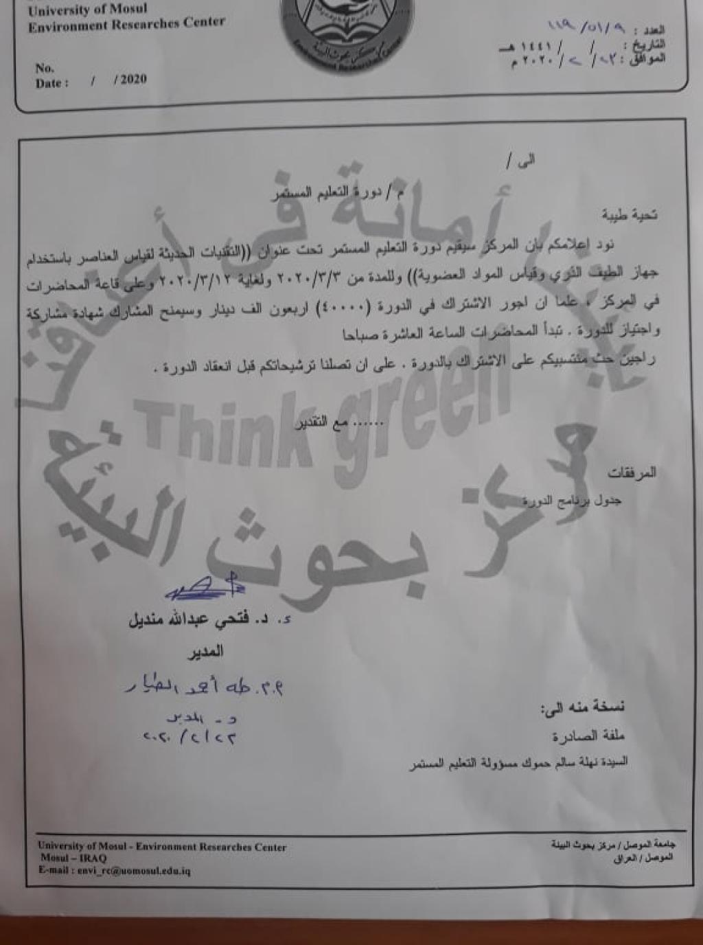 يقيم مركز بحوث البيئة دورة التعليم المستمر تحت عنوان ( التقنيات الحديثة لقياس العناصر باستخدام جهاز الطيف الذري وقياس المواد العضوية) وللفترة من ٣ الى ١٢ اذار ٢٠٢٠ في قاعة محاضرات مركز بحوث السدود والموارد المائية علما ان اجور الاشتراك في الدورة (٤٠٠٠٠) اربعون الف دينار وسيمنح المشارك شهادة مشاركة واجتياز للدورة، وستبدا المحاضرات الساعة العاشرة صباحا.
