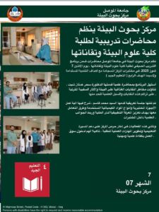 نظّم مركز بحوث البيئة في جامعة الموصل محاضرات ضمن برنامج التدريب الصيفي لطلبة كلية علوم البيئة وتقاناتها ، يوم الإثنين 7 تموز 2025 ، في مختبرات المركز انسجامًا مع أهداف التنمية المستدامة، لاسيما الهدف الرابع منها (التعليم الجيد).
