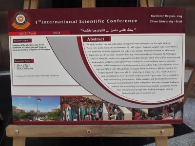الينابيع الكبريتية في منطقة حمام العليل كان اساس فكرة البوستر العلمي الذي شارك فيه الاستاذ المساعد طه احمد الطيار والسيدة مي عبدالحافظ عبدالقادر/مدرس في المؤتمر العلمي الدولي الاول لجامعة جيهان الذي استمر ليومين الاحد والاثنين 20 -2014/4/21 في اربيل حيث تم تسليط الضوء على الخصائص الفيزيائية والكيميائية والبكتريولوجية للينابيع والجداول في موقع الدراسة