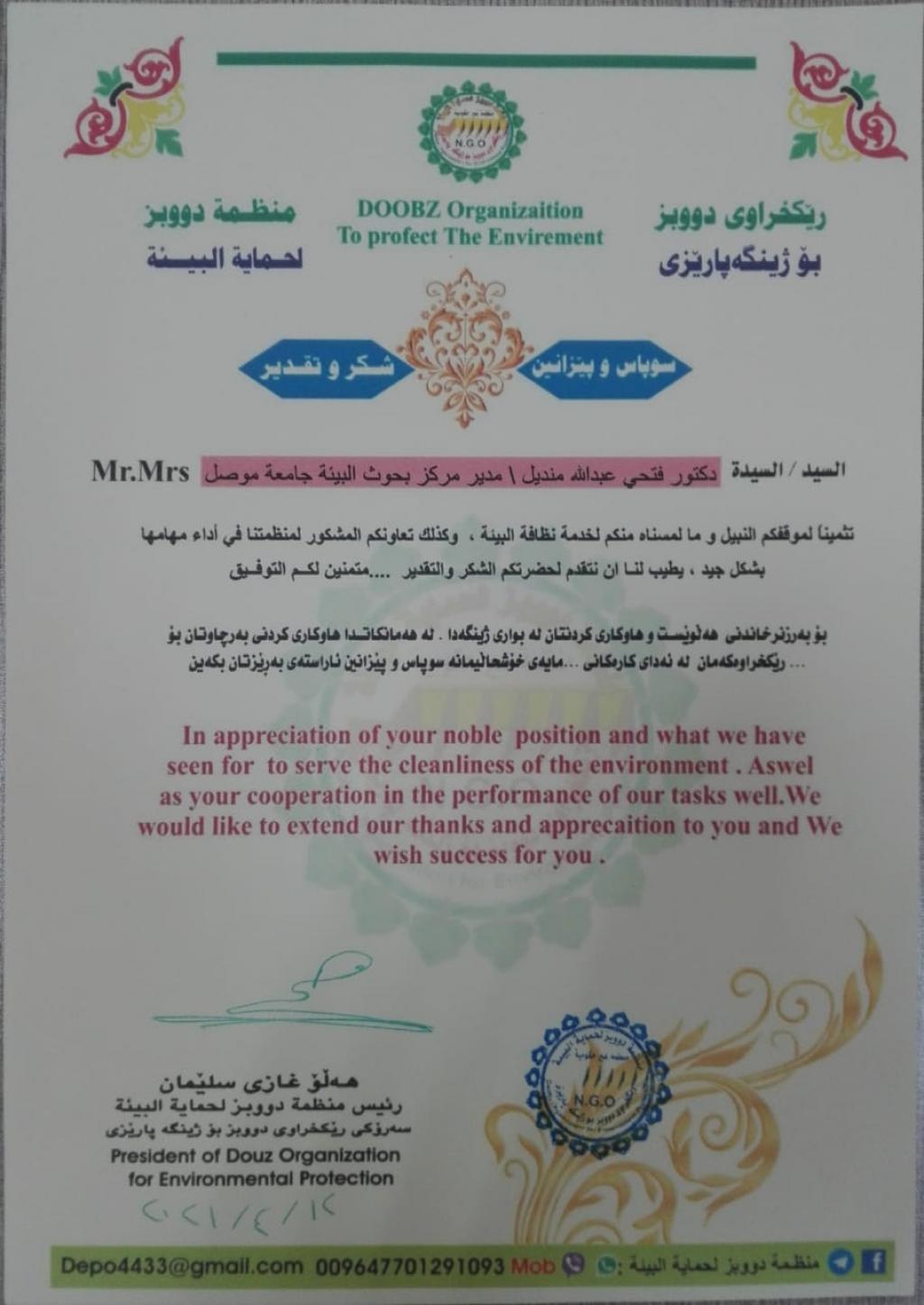 منظمة دوبز لحماية البيئة تقدم كتاب شكر وتقدير لمدير مركز بحوث البيئة.