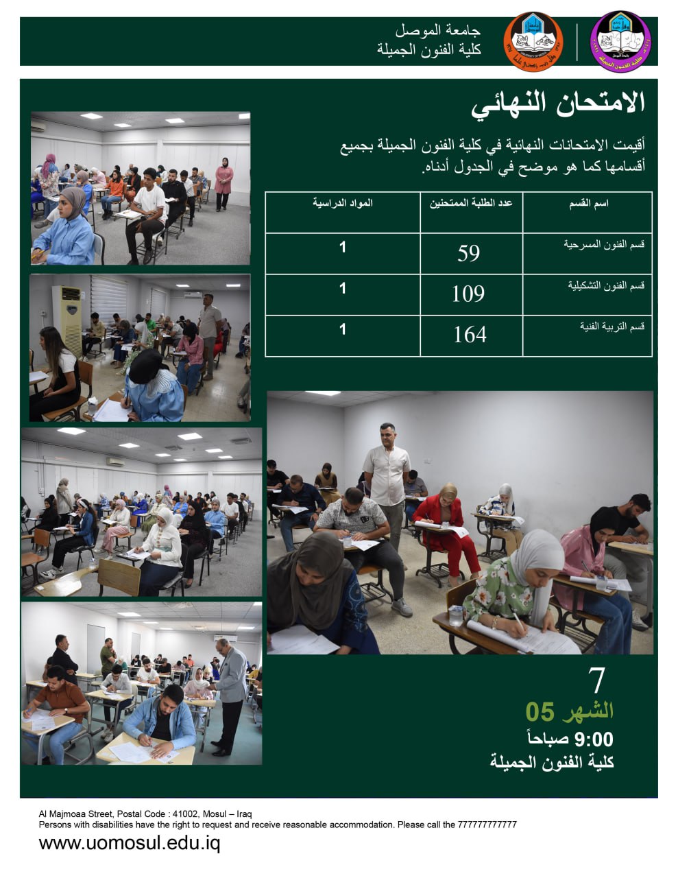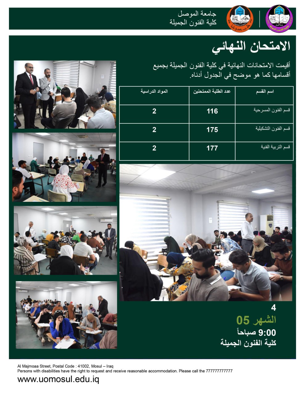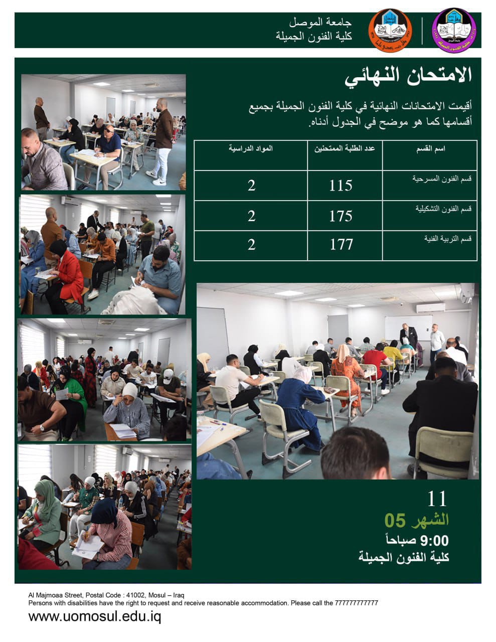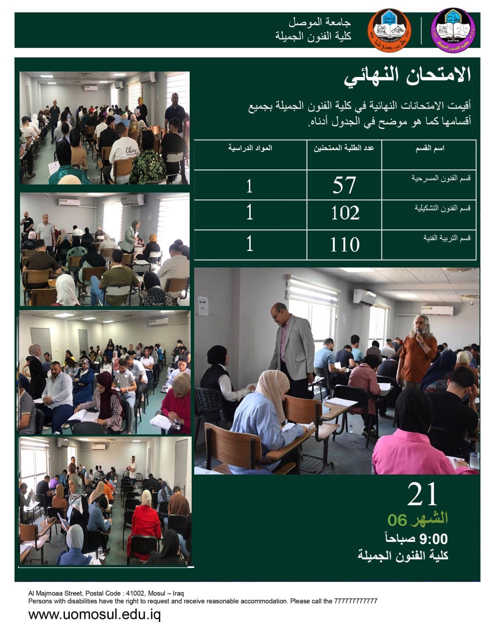كلية الفنون الجميلة في جامعة الموصل صرح علمي وثقافي وفني مهم في محافظة نينوى، من واجباتها تعزيز إمكانيات الفرد والمجتمع فنياً ومعرفياً, وتهدف الكلية إلى خلق بيئة أكاديمية محفزة على الإبداع والابتكار. لقد دأبت الكلية منذ تأسيسها في العام 1994 على تأكيد حضورها في بناء المجتمع وتطويره, حيث تضم الكلية ثلاثة أقسام علمية هي ( قسم الفنون المسرحية – قسم الفنون التشكيلية – قسم التربية الفنية ) إلى جانب الدراسات العليا في بعض الأقسام، لهذا تعد كلية الفنون الجميلة في جامعة الموصل من المنافذ الرئيسية المهمة لتخريج مبدعين وفنانين يرفدون المشهد الفني والثقافي في مدينة الموصل. إقرأ المزيد