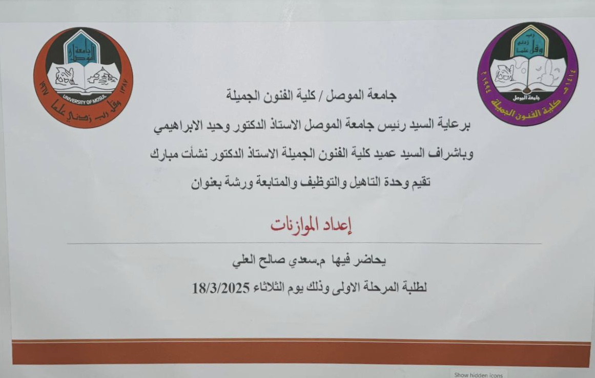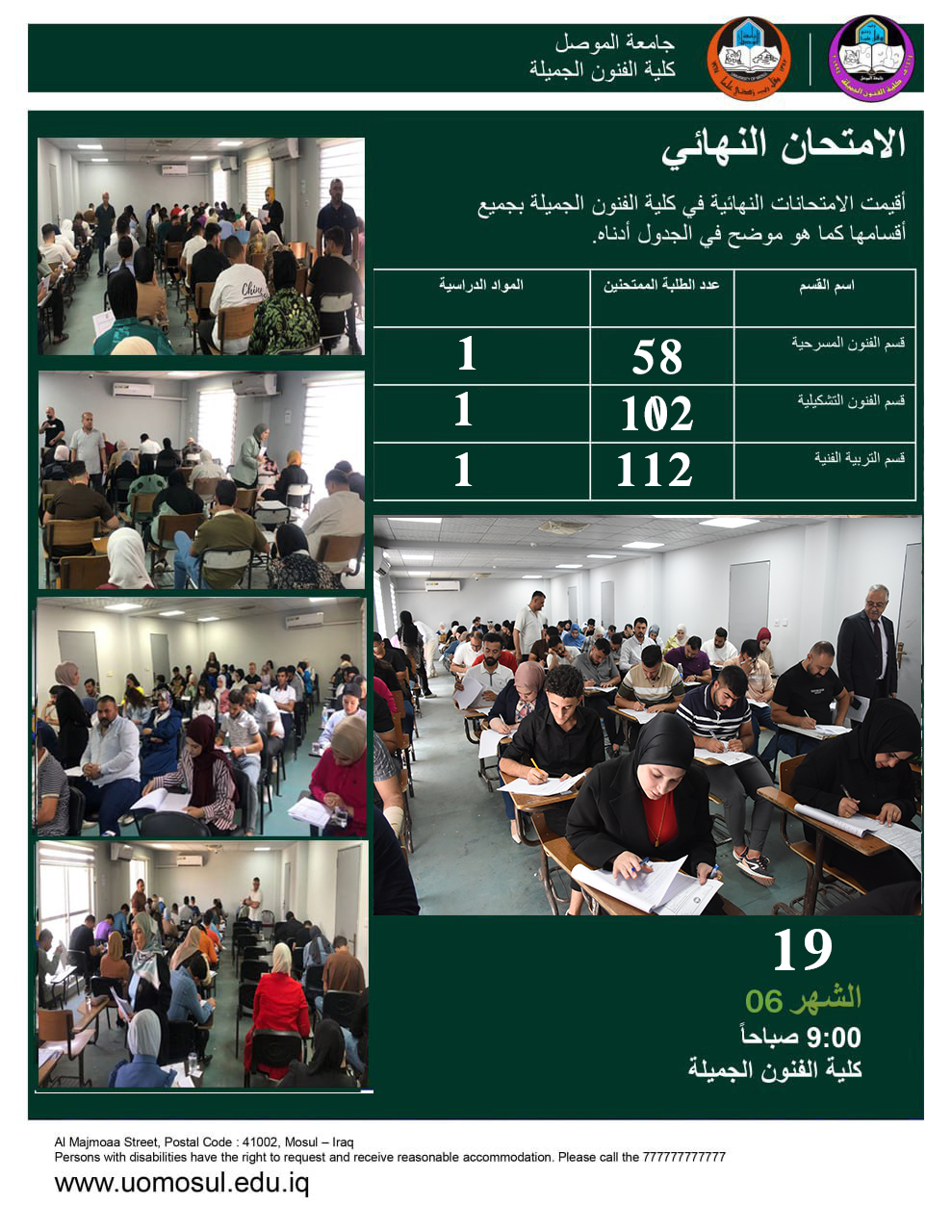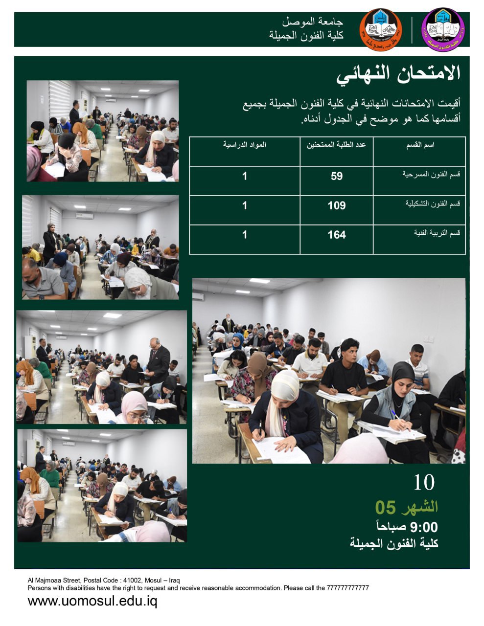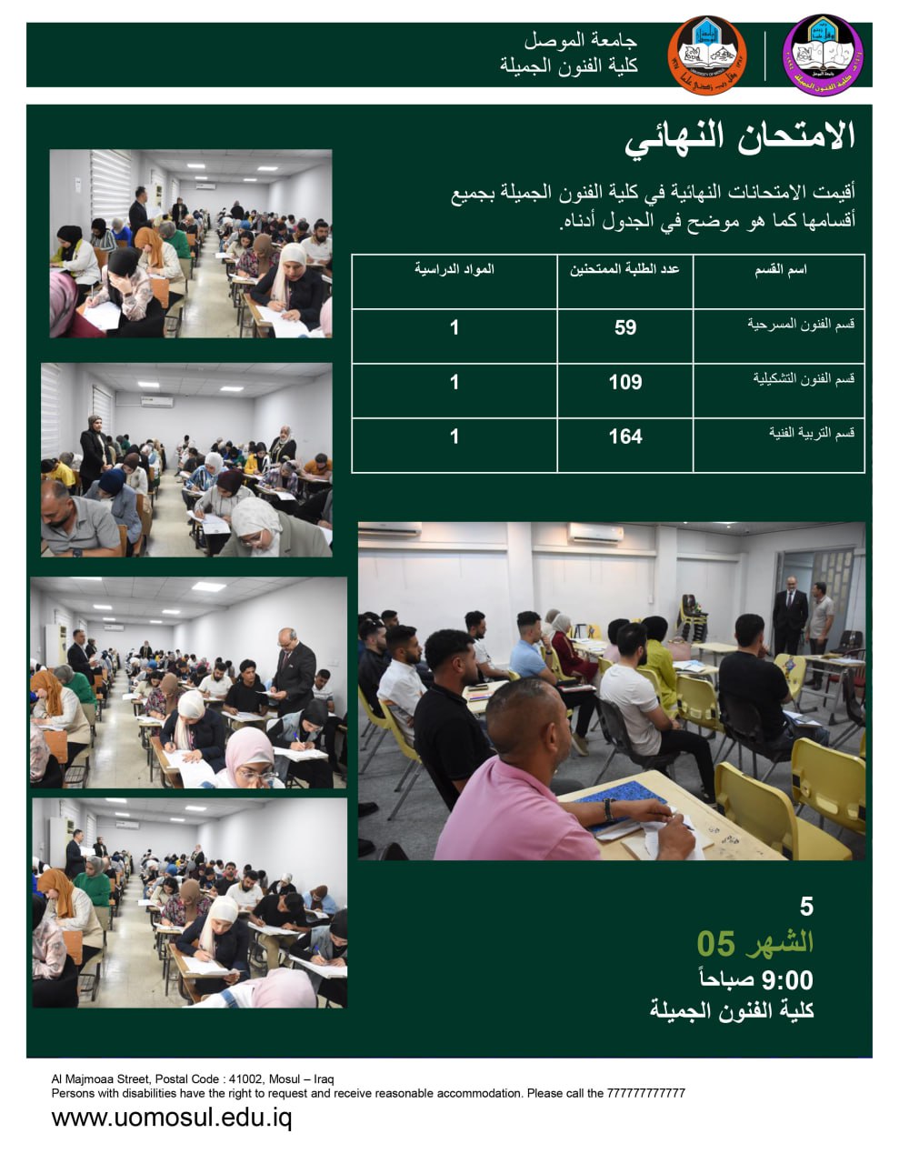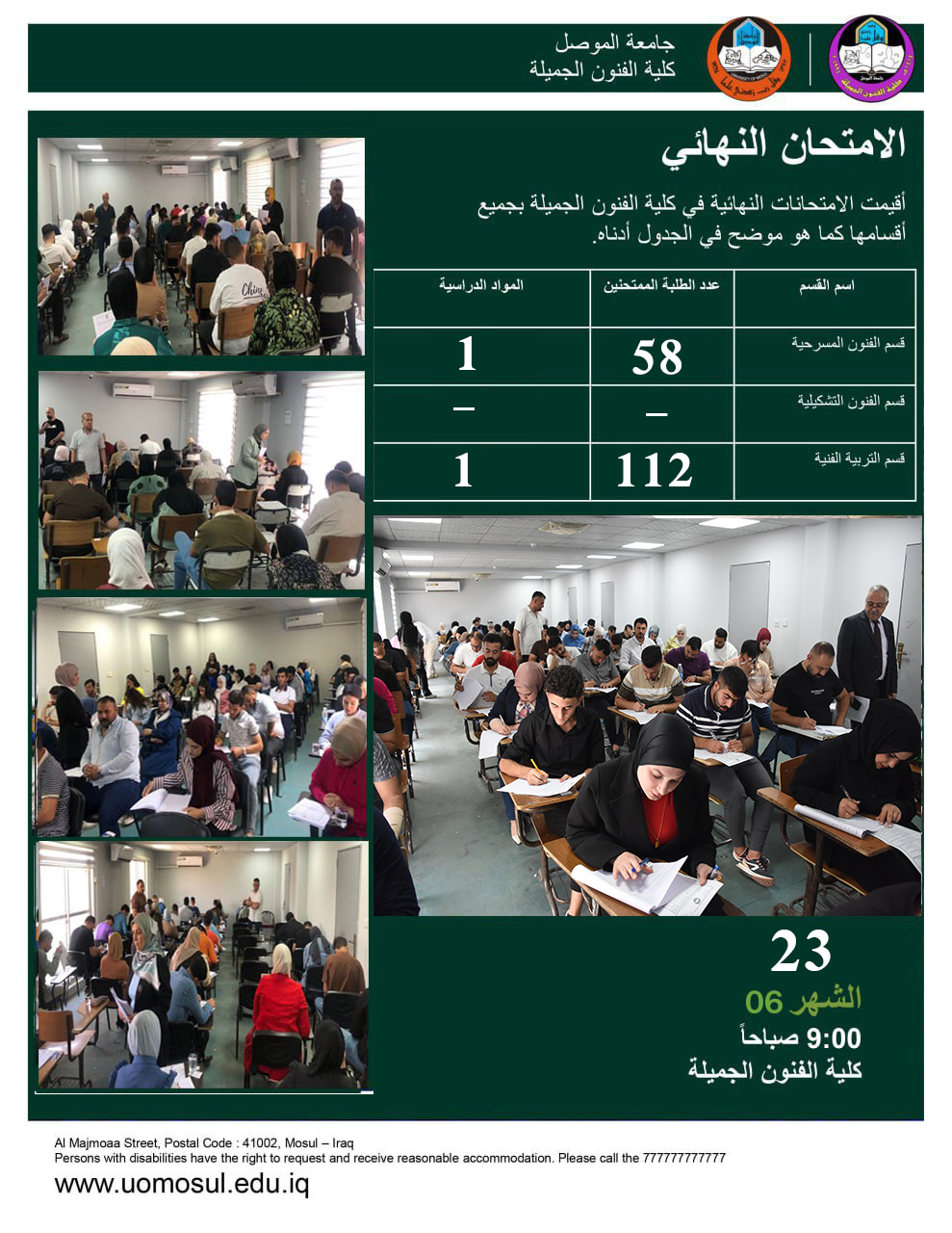 كلية الفنون الجميلة في جامعة الموصل صرح علمي وثقافي وفني مهم في محافظة نينوى، من واجباتها تعزيز إمكانيات الفرد والمجتمع فنياً ومعرفياً, وتهدف الكلية إلى خلق بيئة أكاديمية محفزة على الإبداع والابتكار. لقد دأبت الكلية منذ تأسيسها في العام 1994 على تأكيد حضورها في بناء المجتمع وتطويره, حيث تضم الكلية ثلاثة أقسام علمية هي ( قسم الفنون المسرحية – قسم الفنون التشكيلية – قسم التربية الفنية ) إلى جانب الدراسات العليا في بعض الأقسام، لهذا تعد كلية الفنون الجميلة في جامعة الموصل من المنافذ الرئيسية المهمة لتخريج مبدعين وفنانين يرفدون المشهد الفني والثقافي في مدينة الموصل. إقرأ المزيد