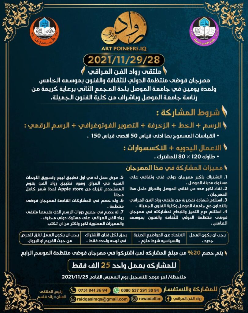 بهدف تشجيع النشاطات الابداعية في كلية الفنون الجميلة تعتزم الكلية إقامة دورة تدريبية افتراضية باستخدام تطبيق Google Classroom لتعليم الخط الكوفي لطلبة الكلية بإشراف الخطاط الأستاذ يوسف السماك.تبدأ الدورة يوم الاحد المقبل الموافق ٢١/ ١١ ولغاية ٢٥/ ١١ / ٢٠٢١ ولمدة ٥ ايام بواقع نصف ساعة يوميا ، حيث تجرى محاضرات الدورةفي تمام الساعة( ١٠ مساءاً ) كل يوم بشكل فيديوي و يتم تسليم الواجبات للمشتركين حضوريا في الكلية.يستمر تسجيل المشاركين من يوم الثلاثاء الموافق ١٦/ ١١ولغاية يوم الجمعةالموافق ١٩ /١١ / ٢٠٢١ عن طريق رمز الصف المرفق .ملاحظة : سيكون هناك اختبار اولي الكتروني يوم السبت الموافق٢٠ / ١١ الساعة ٩ الى ١١ مساءاً قبل بدء الدورة لتقييم مستوى المتقدمينوالذي على اساس نتائجه يتم اختيار المرشحين للدورة عن طريق رمز الصف المرفق.يمنح من إجتاز الدورة بنجاح شهادة مشاركةرمز الصف y6i2r7i