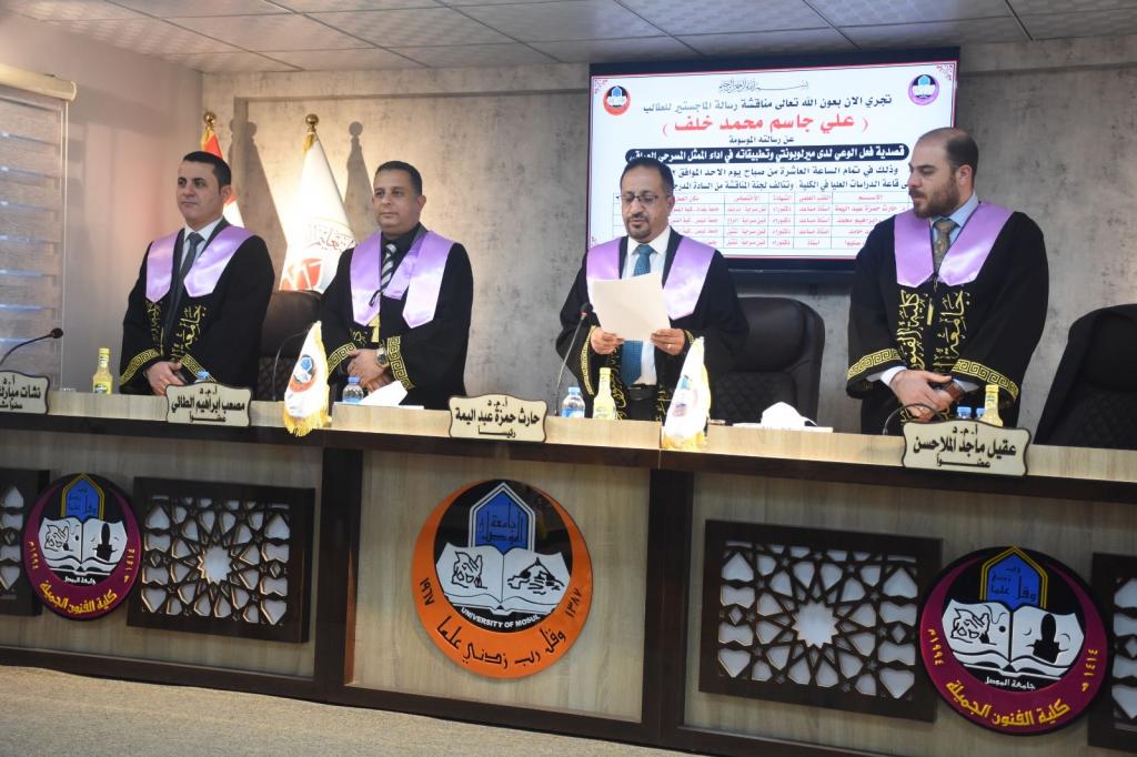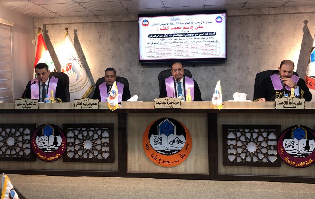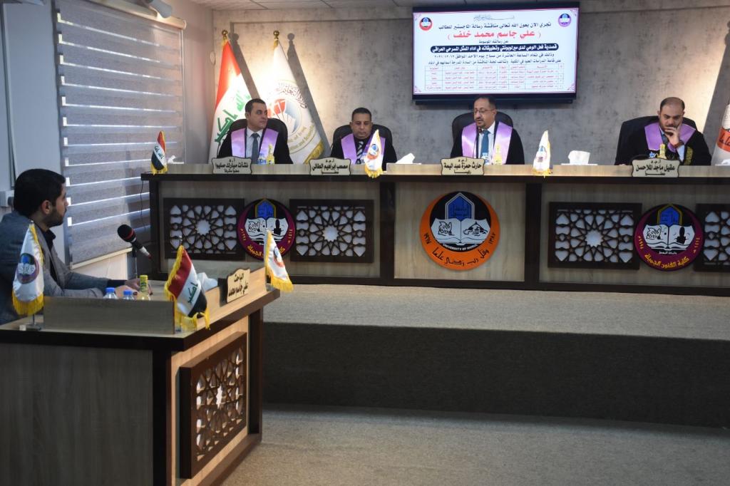 وقد ترأس لجنة المناقشة الأستاذ المساعد الدكتور حارث حمزة عبد اليمة من جامعة بغداد/ كلية الفنون الجميلة وعضوية كل من الأستاذ المساعد الدكتور مصعب ابراهيم محمد من جامعة الموصل / كلية الفنون الجميلة والاستاذ المساعد الدكتور عقيل ماجد حامد من جامعة الموصل / كلية الفنون الجميلة وبإشراف وعضوية الأستاذ الدكتور نشأت مبارك صليوا من جامعة الموصل / كلية الفنون الجميلة.