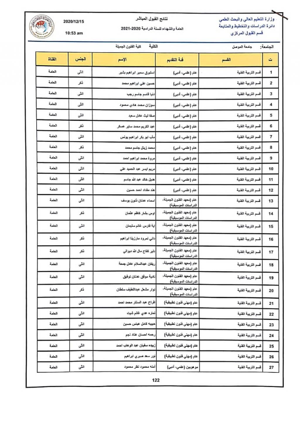 تعلن عمادة كلية الفنون الجميلة – جامعة الموصل عن اسماء الطلبة المقبولين في كليتنا للعام الدراسي 2020 – 2021 الدراسة الصباحية قناة ( القبول المباشر ) وحسب الاقسام العلمية .ملاحظة :علىجميع الطلبة المشمولين بالقبول على القناة المذكورة مراجعة شعبة التسجيل في الكلية لاستكمال اجراءات القبول والمباشرة .