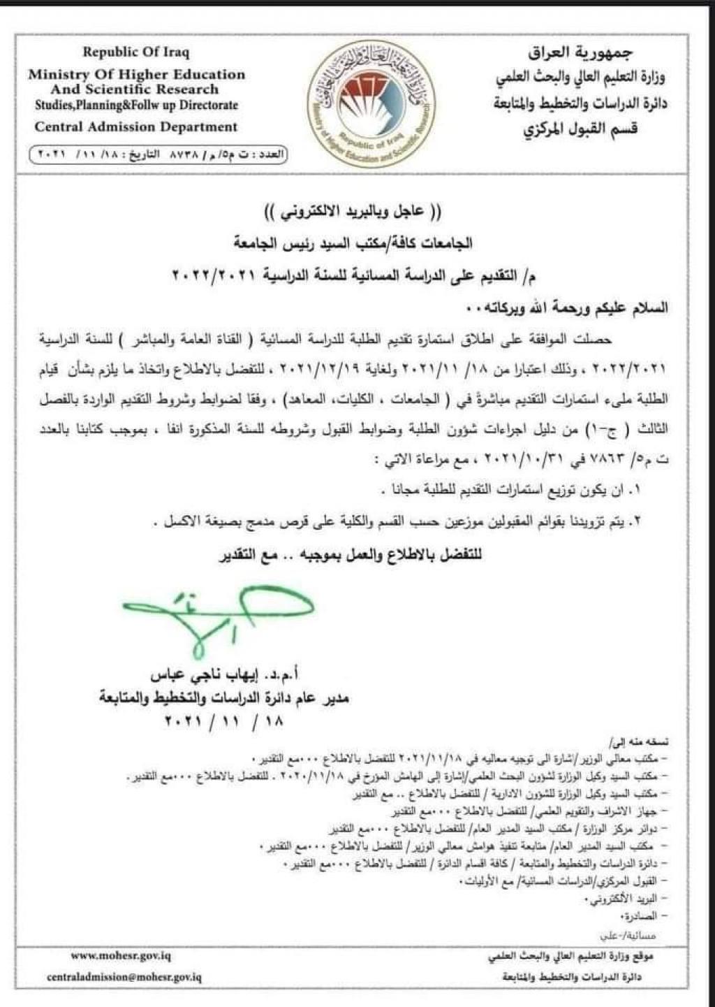 تعلن كلية الفنون الجميلة / جامعة الموصل عن فتح باب التقديم للدراسة المسائية للاقسام العلمية ( التربية الفنية – الفنون المسرحية – الفنون التشكيلية ) فعلى الراغبين بالتقديم مراجعة شعبة التسجيل المسائي في الكلية بدءاً من يوم الاحد القادم الموافق ٢١ /١١ / ٢٠٢١ حسب الكتاب المرفق ادناه