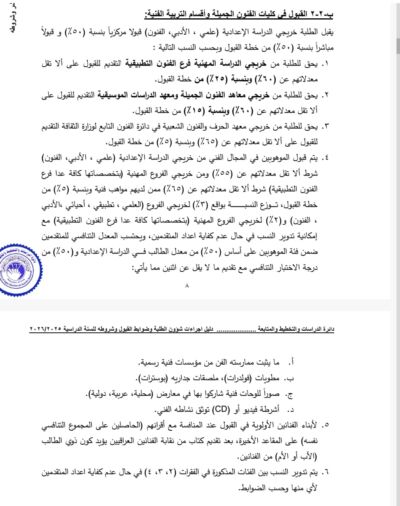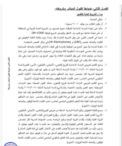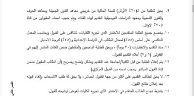 الى الطلبة الراغبين بالتقديم الى كلية الفنون الجميلة / الدراسة الصباحية للعام الدراسي ٢٠٢٥-٢٠٢٦ قبولاً مباشراً مراجعة شعبة التسجيل الصباحي في الكلية لغرض التقديم ، علماً ان فترة التقديم تبدأ من ٧ / ٩ / ٢٠٢٥ ولغاية ٢٥ / ٩ / ٢٠٢٥ ، وادناه الشروط والضوابط العامة المرفقة للتقديم المباشر .
