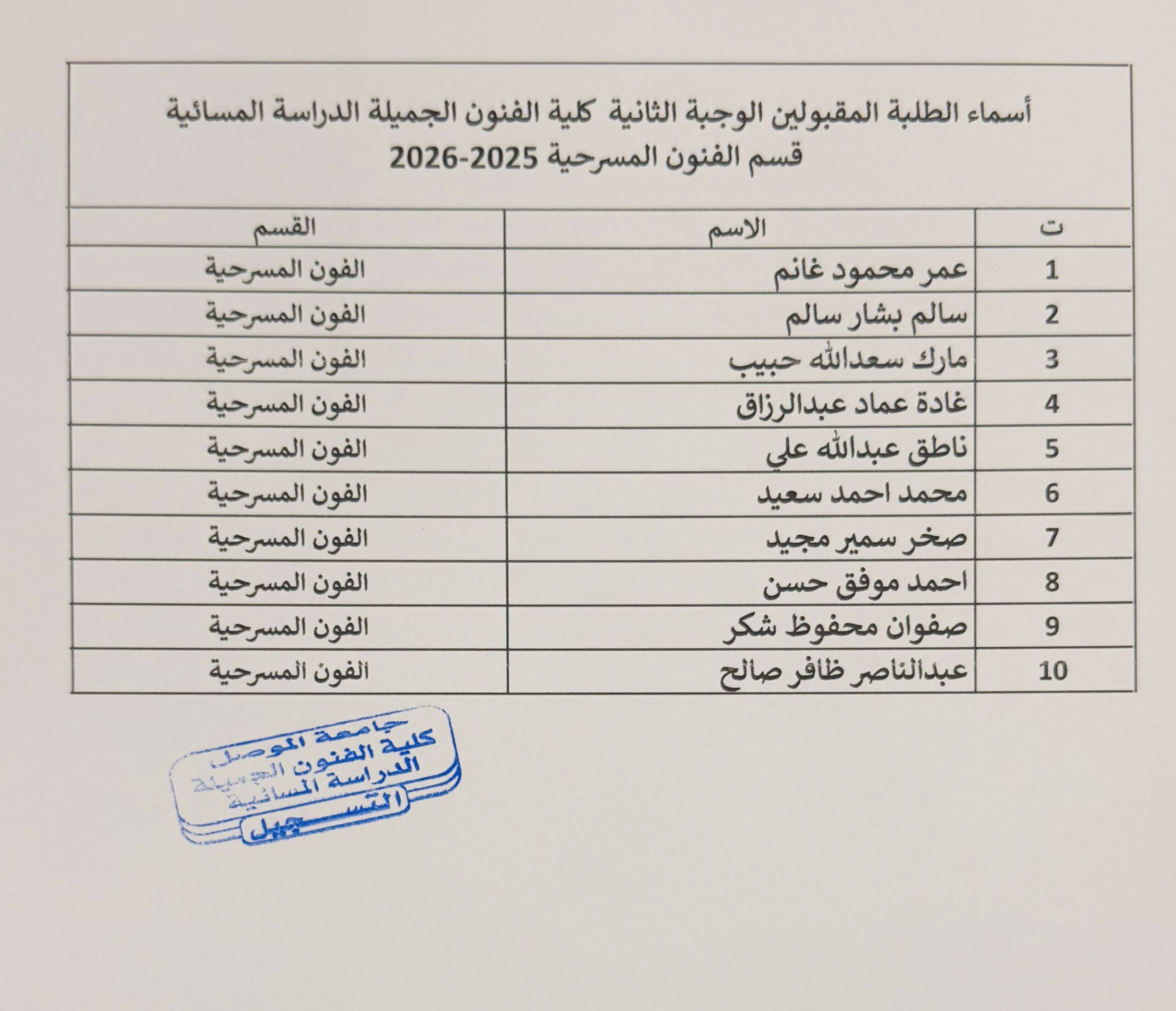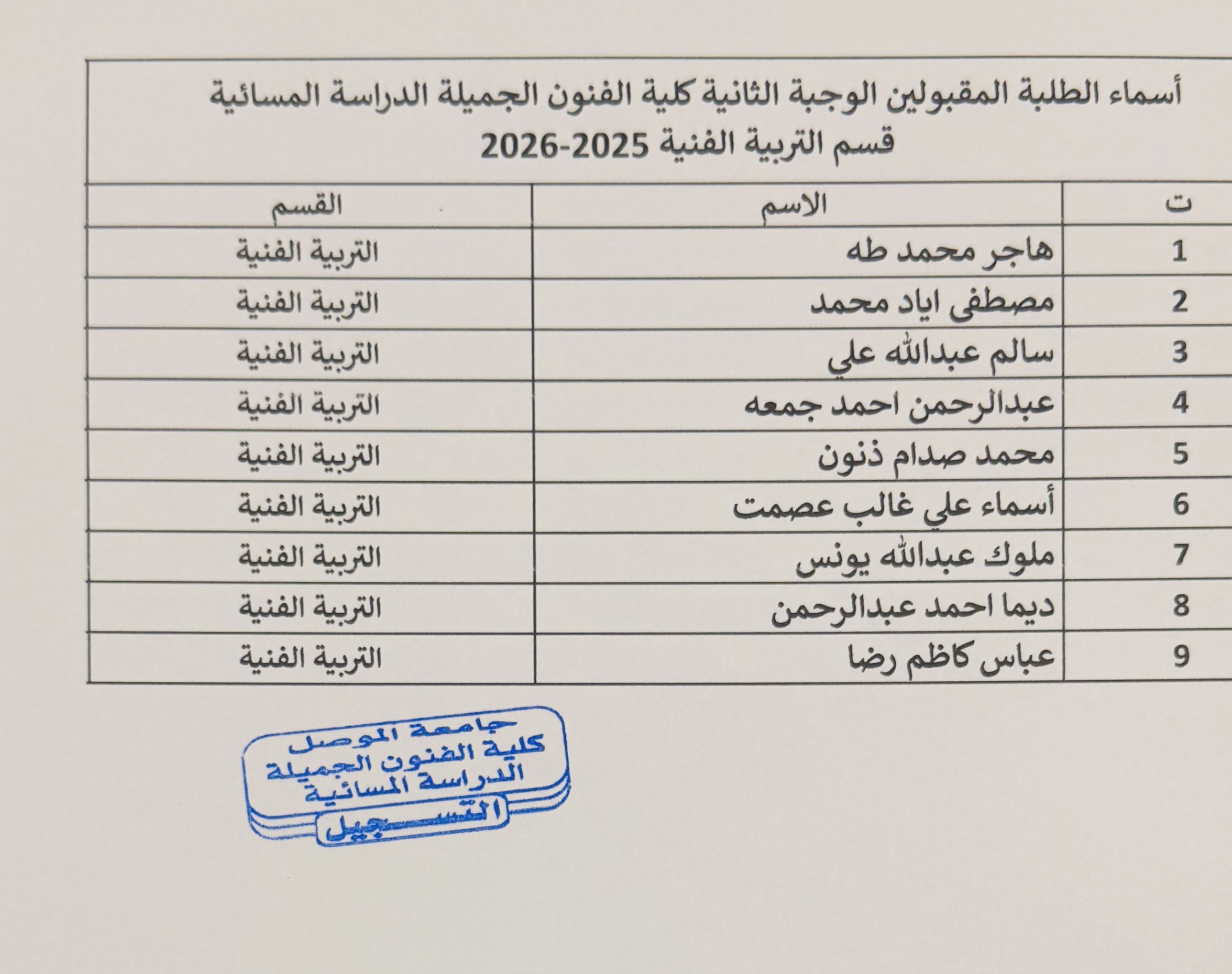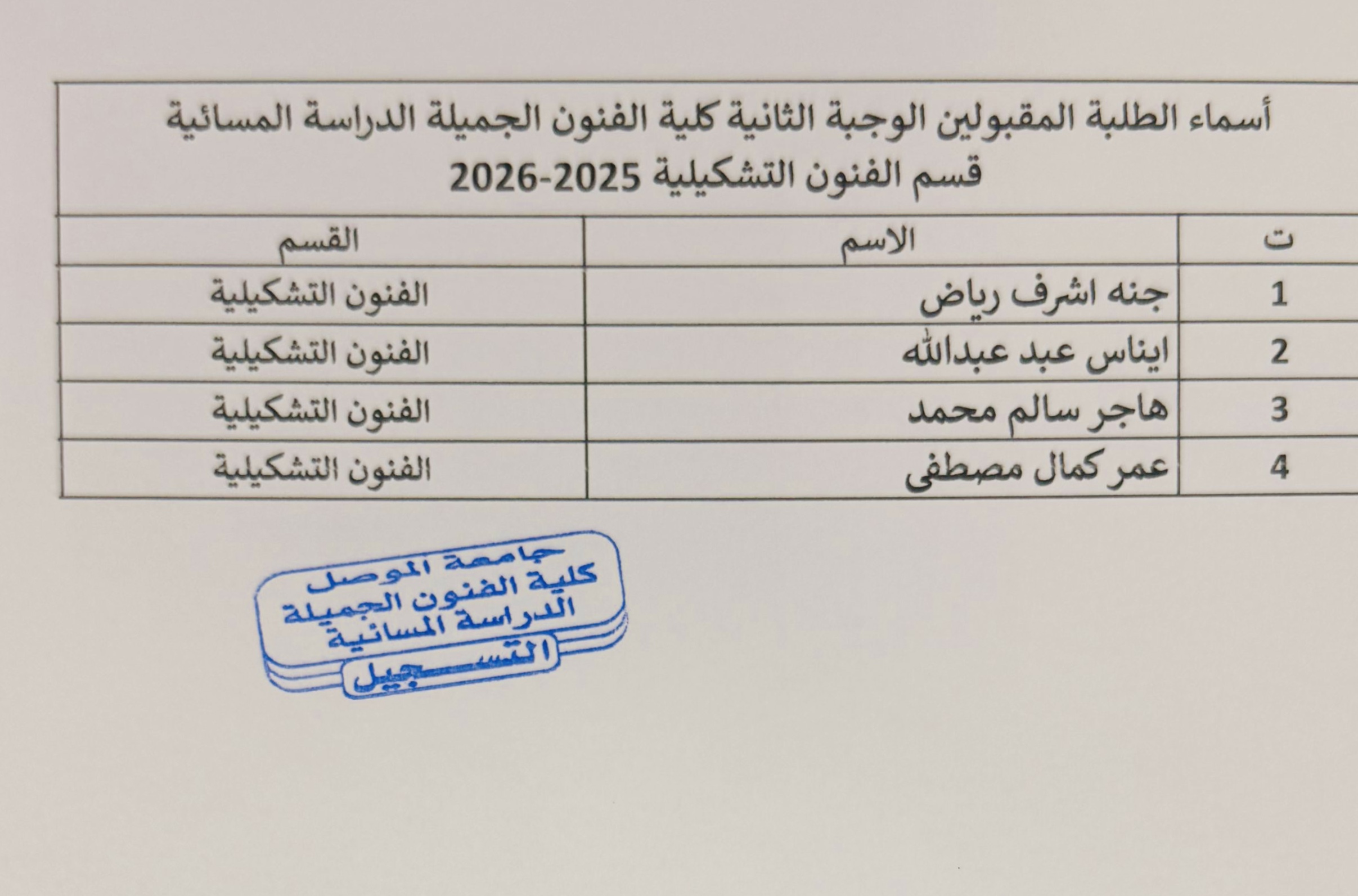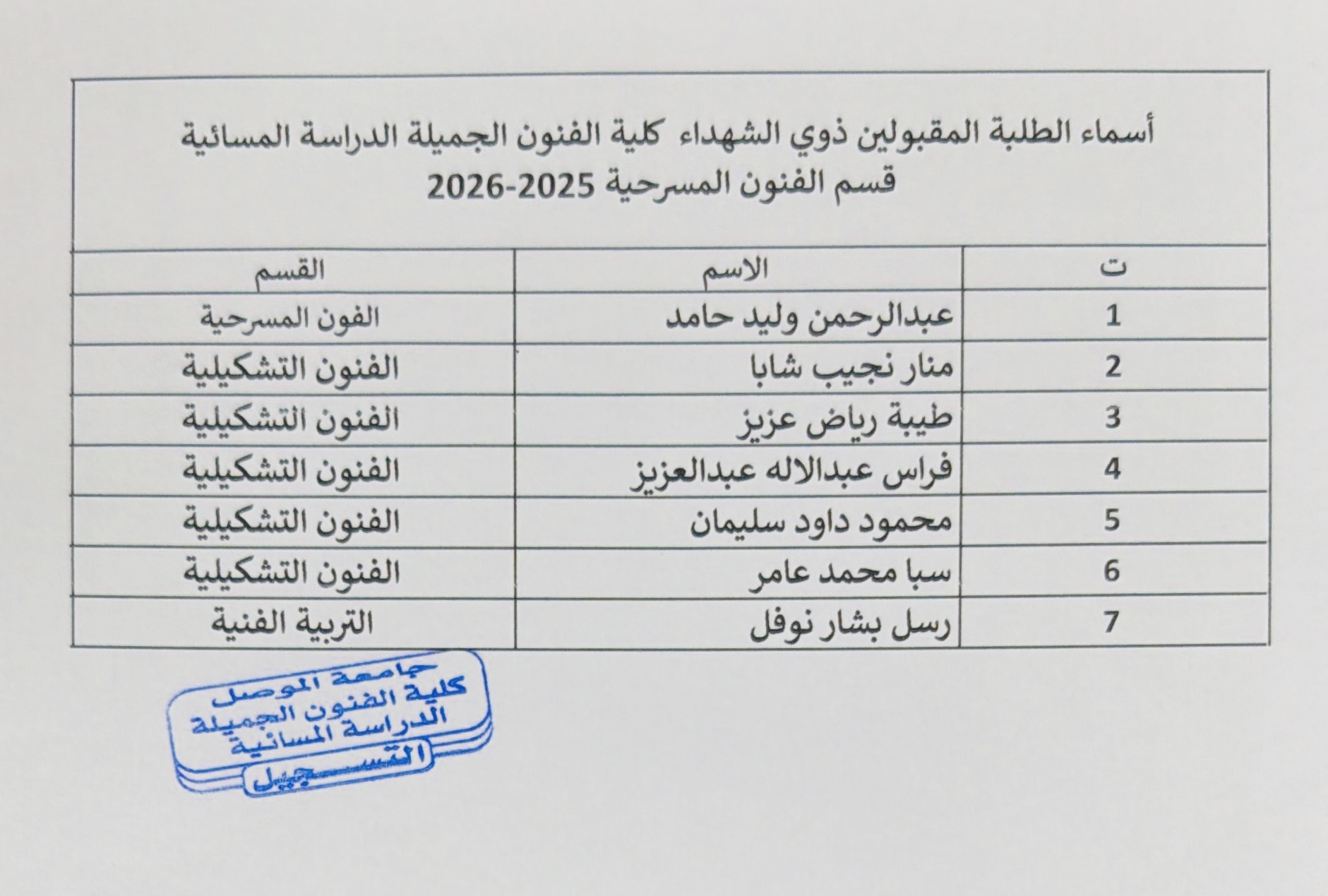 على الطلبة المقبولين في كلية الفنون الجميلة من الوجبة الثانية و ذوي الشهداء / الدراسة المسائية للعام ٢٠٢٥-٢٠٢٦ والمدرجة اسمائهم في القوائم المرفقة ، مراجعة شعبة التسجيل المسائي في الكلية لغرض استكمال اجراءات التسجيل .