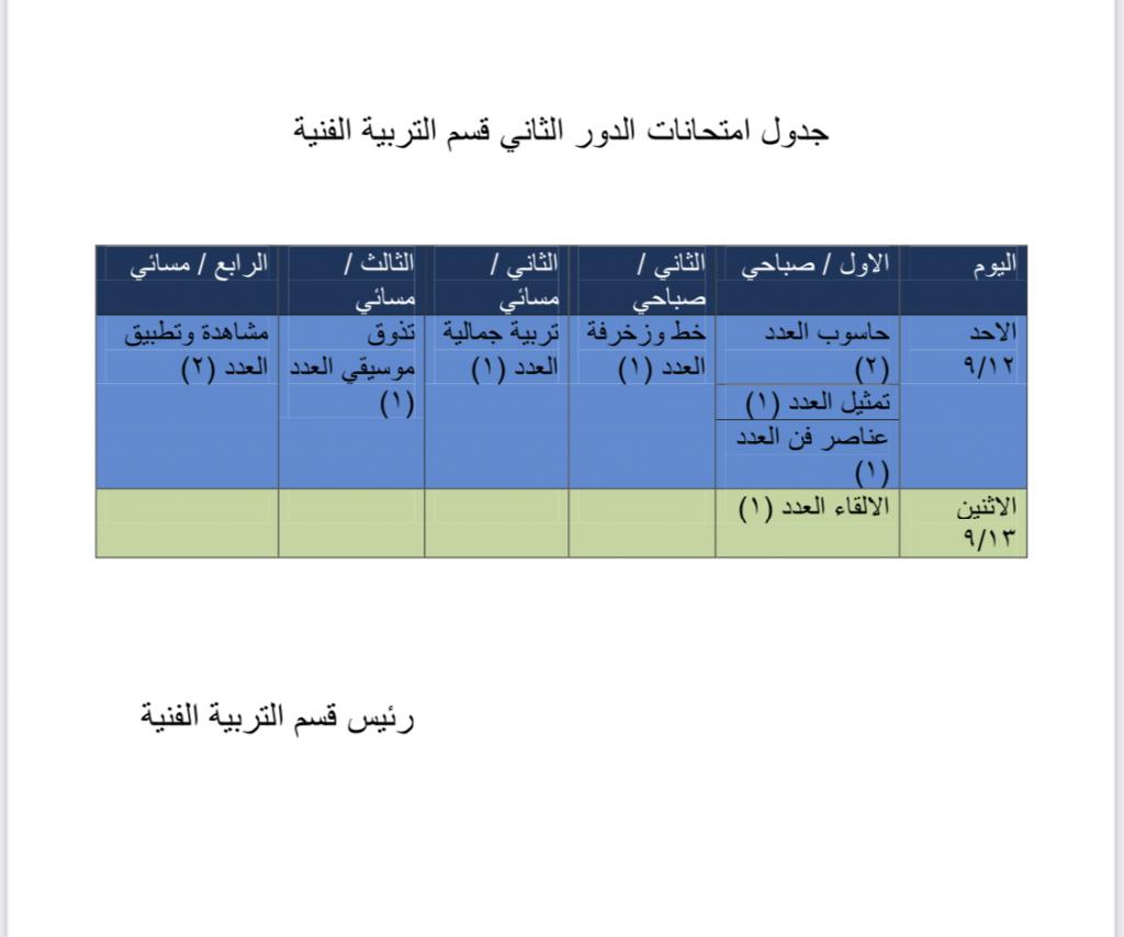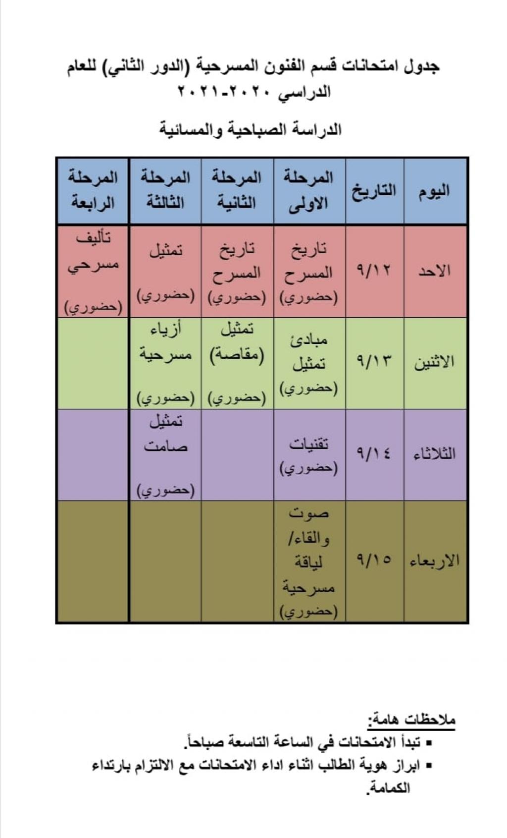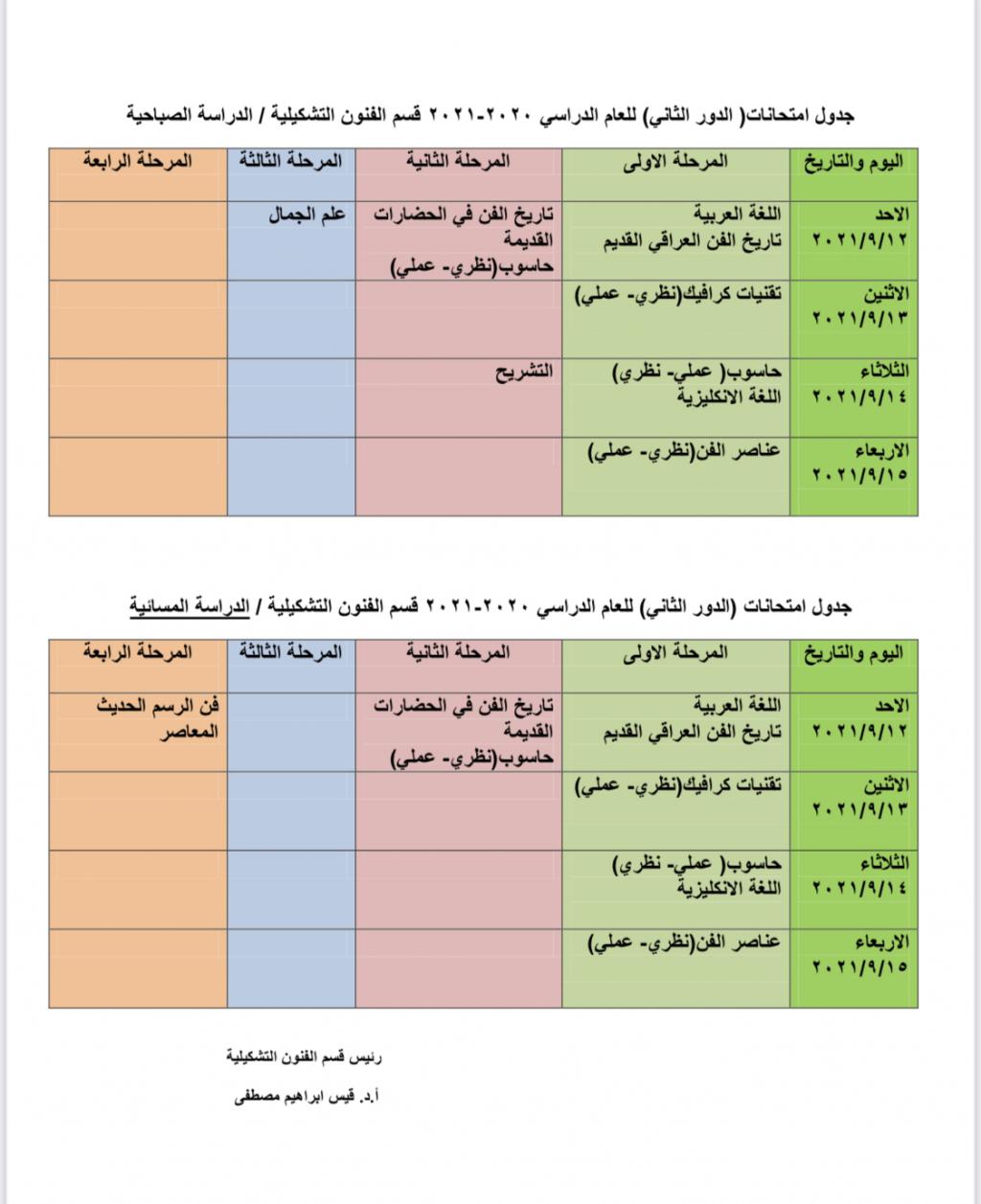 تعلن كلية الفنون الجميلة عن موعد امتحانات الدور الثاني لكافة الاقسام وللدراستين الصباحية والمسائية للعام الدراسي ٢٠٢٠-٢٠٢١ .ملاحظة :