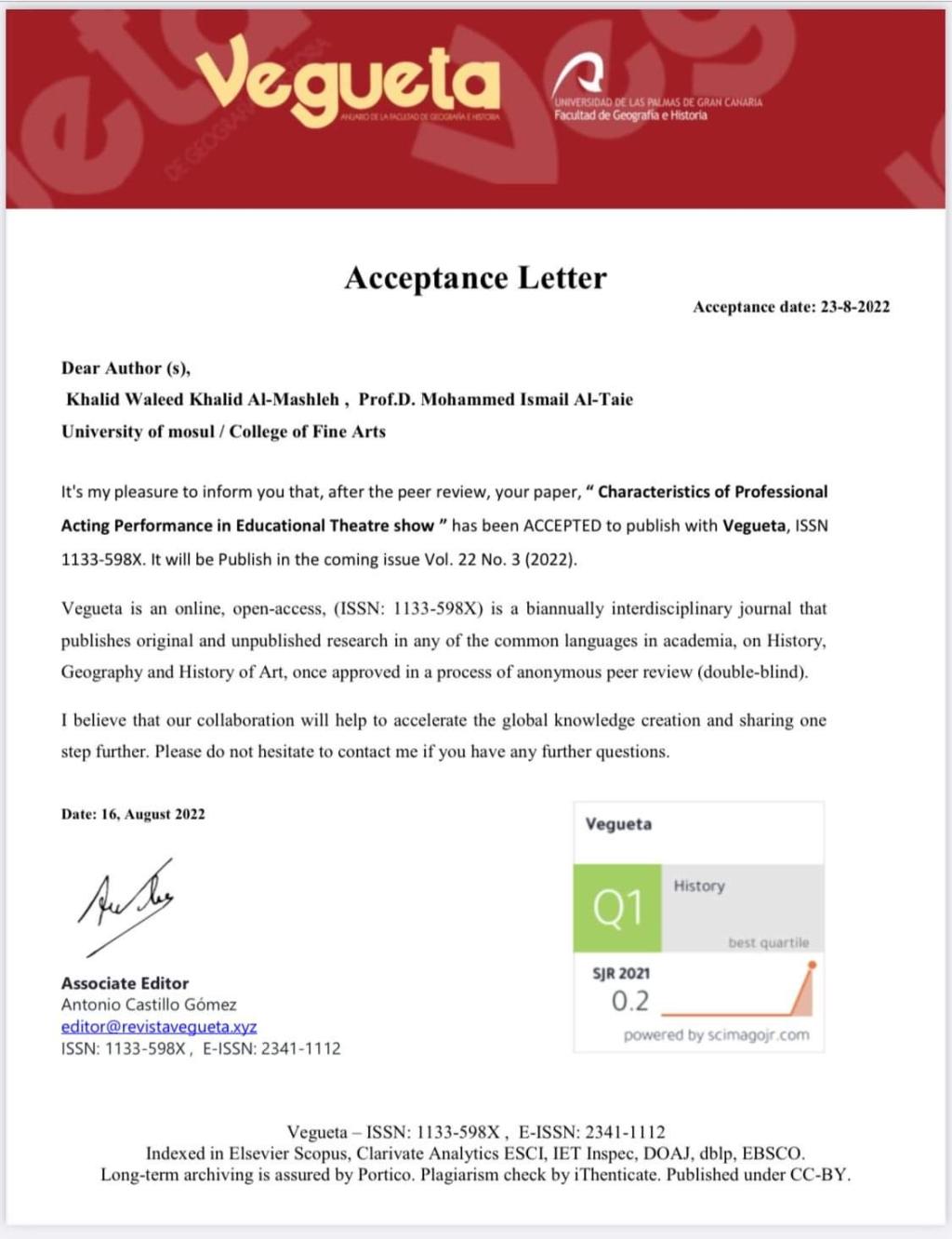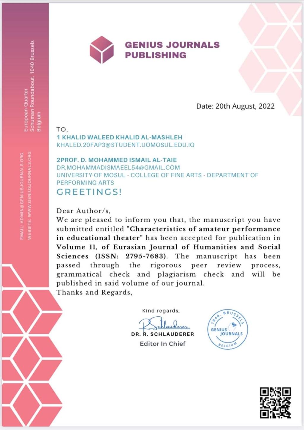 جهد علمي متميز مشترك بين الأستاذ الدكتور محمد اسماعيل الطائي احد أعضاء الهيئة التدريسية في كلية الفنون الجميلة وطالب الدراسات العليا خالد وليد خالد ( ماجستير فنون مسرحية ) من خلال نشر بحثين ضمن المستوعب الأول Q1 للمجلات العالمية الأكاديمية Scopus.1.Characteristics of Professional Acting Performance in Educational Theatre show