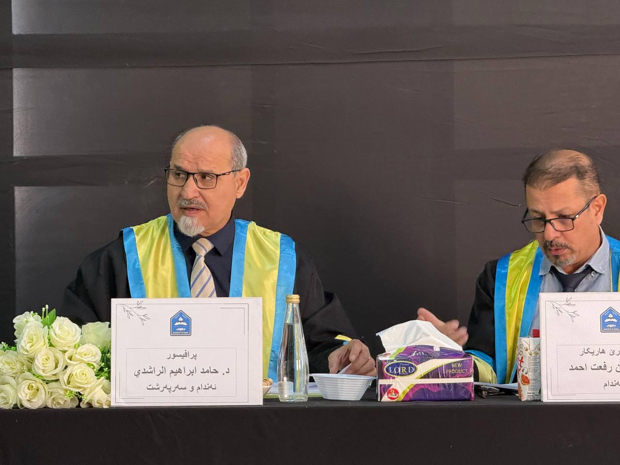 شارك الأستاذ الدكتور حامد ابراهيم الراشدي عميد كلية الفنون الجميلة وكل من الاستاذ المساعد الدكتور زياد خلف حسن والاستاذ المساعد محمد ذنون صالح من قسم الفنون التشكيلية ضمن لجنة مناقشة رسالة ماجستير في جامعة دهوك للطالب سيروان شاكر رشيد ، ورسالته الموسومة (الجمالية بين الرسم والعمارة في فنون الحداثة – دراسة تحليلية لنماذج في العراق ) الخميس ٢٣ تشرين الاول ٢٠٢٥ وتألفت لجنة المناقشة من الذوات المدرجة اسماءهم ادناه