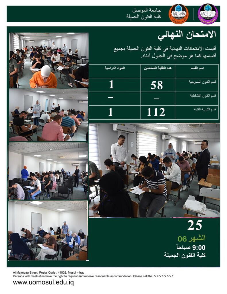 علماً ان موعد الامتحان التنافسي للمتقدمين للدراسات العليا سيكون يوم الاثنين الموافق ٣٠ / ٦ / ٢٠٢٥ الساعة التاسعة صباحاً ولمدة ثلاث ساعات ، وموعد المقابلة سيكون يوم الثلاثاء الموافق ١ /٧/ ٢٠٢٥ الساعة التاسعة صباحاً ( في الاقسام العلمية ) .
