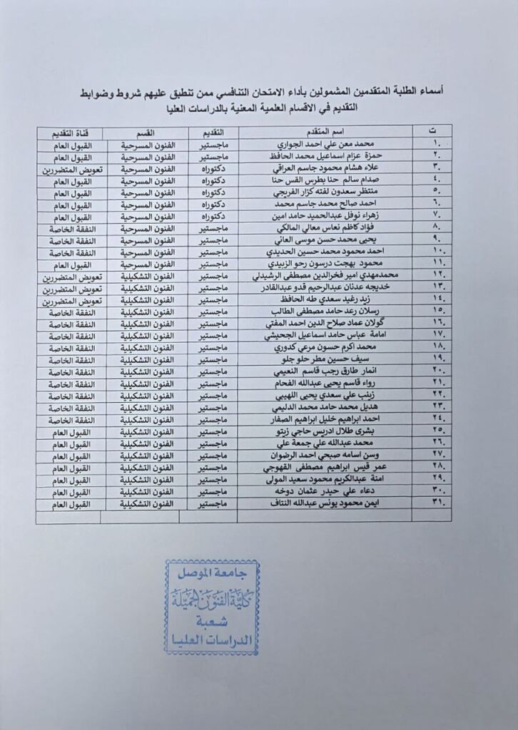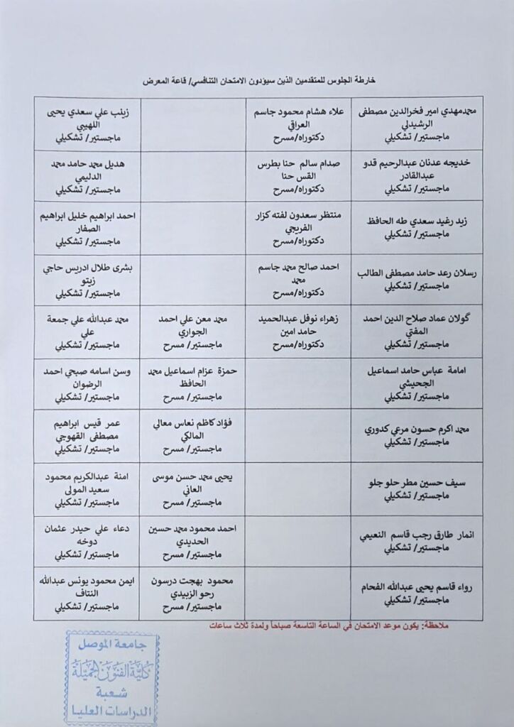 تعلن عمادة كلية الفنون الجميلة عن اسماء الطلبة المشمولين بأداء الامتحان التنافسي وخارطة الجلوس .