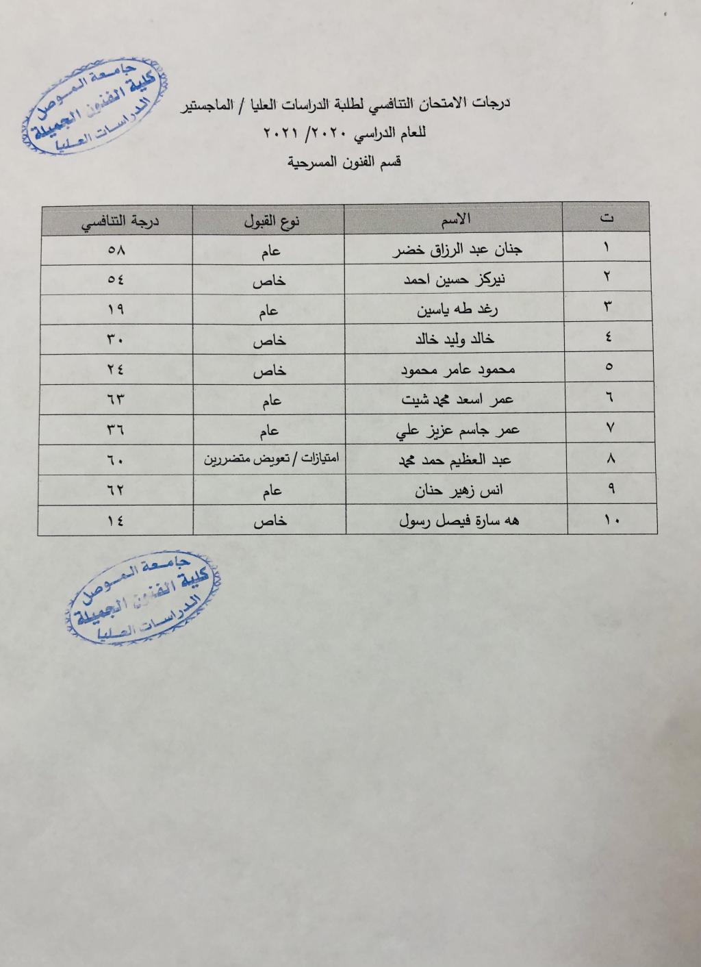 تعلن كلية الفنون الجميلة – جامعة الموصل نتائج الامتحان التنافسي للمتقدمين للدراسات العليا – ماجستير – فنون مسرحية للعام الدراسي 2020-2021 ، على من يرغب في تقديم اعتراض مراجعة شعبة الدراسات العليا في كلية الفنون الجميلة او مراسلة البريد الالكتروني [email protected] ابتداءا من الفترة 22 – 26 تشرين الاول 2020 .