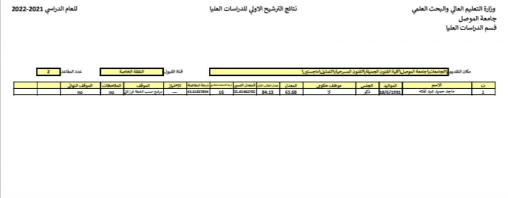 تعلن شعبة الدراسات العليا نتائج القبول الاولي في الدراسات العليا في كلية الفنون الجميلة / جامعة الموصل للعام الدراسي 2021 – 2022 .ملاحظة / يكون تقديم الاعتراض على نتائج القبول الاولي لغاية يوم الاحد الموافق ١٨/ ٧ / ٢٠٢١ في الكلية