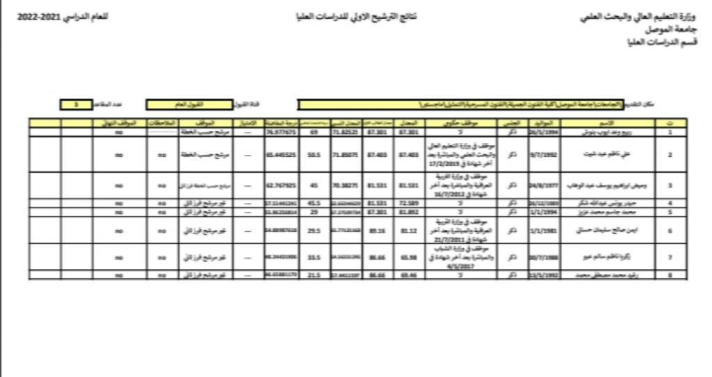 اعلان نتائج القبول الاولي للمتقدمين للدراسات العليا في كلية الفنون الجميلة / جامعةالموصل للعام الدراسي 2021 – 2022