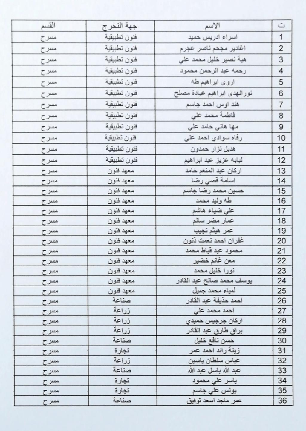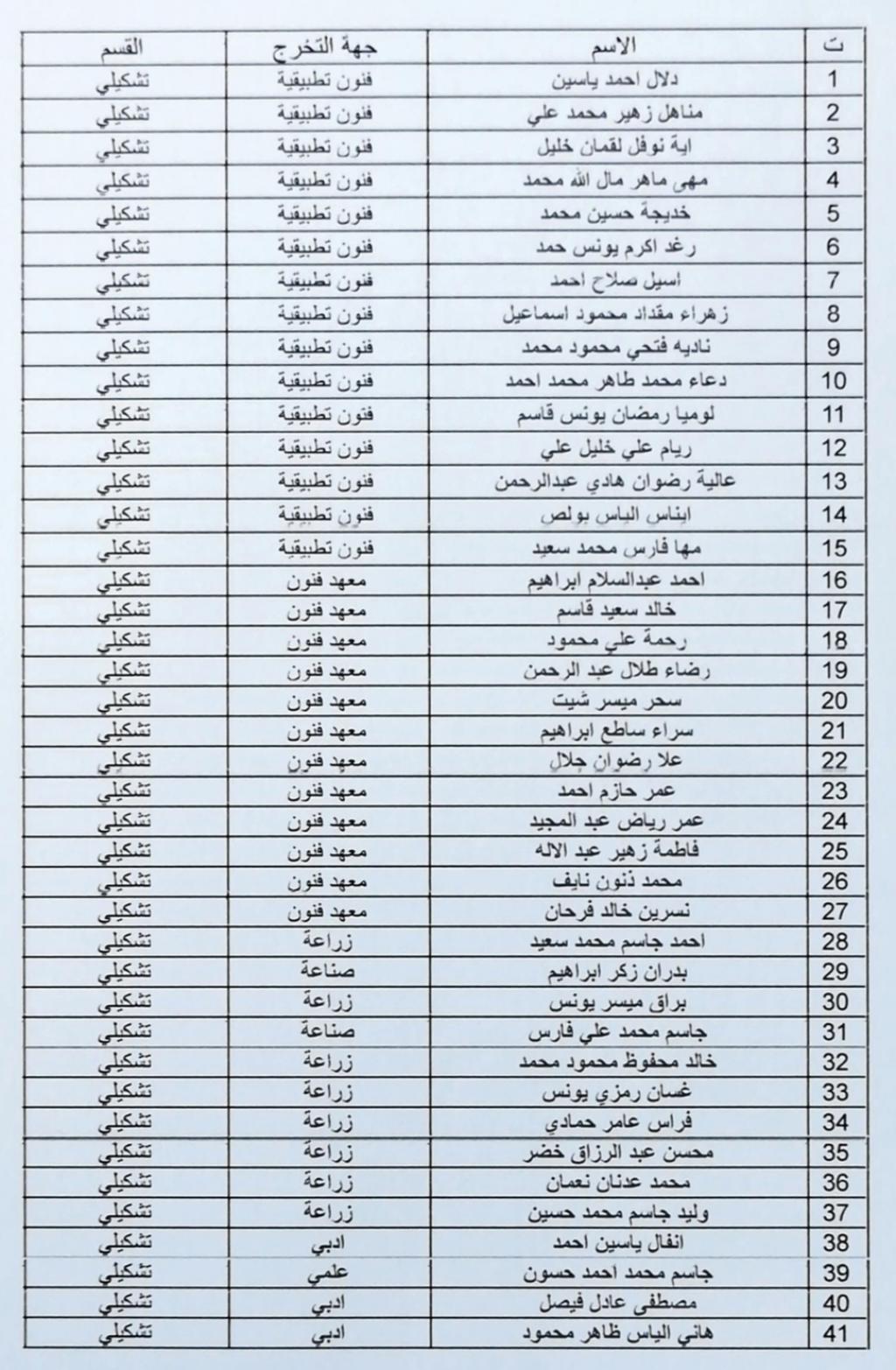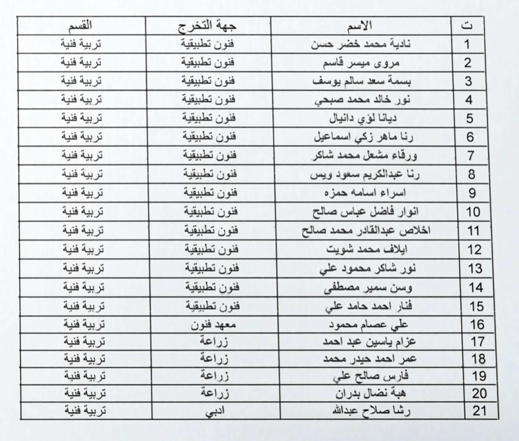 على الذوات المدرجة اسمائهم ادناه والمرشحين للقبول في كلية الفنون الجميلة / الدراسة المسائية للعام ٢٠٢١- ٢٠٢٢ ، مراجعة الكلية شعبة التسجيل المسائي لاستكمال متطلبات التقديم خلال مدة اقصاها اسبوع وبخلافه سيتم رفع اسماء الاحتياط مستصحبين معهم الكفيل والمستمسكات المطلوبة .
