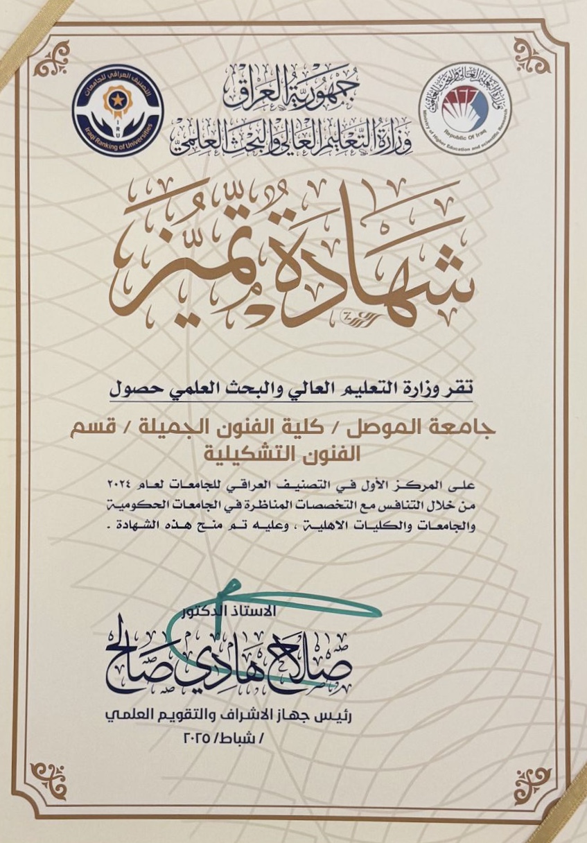وزارة التعليم العالي والبحث العلمي تمنح قسم الفنون التشكيلية في كلية الفنون الجميلة بجامعة الموصل (شهادة تميز) على المركز الاول في التصنيف العراقي للجامعات لعام [إقرأ المزيد]