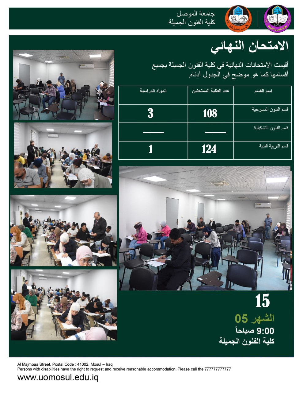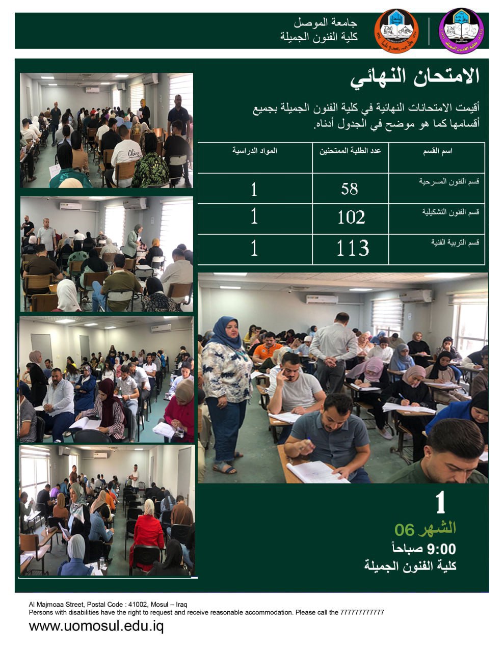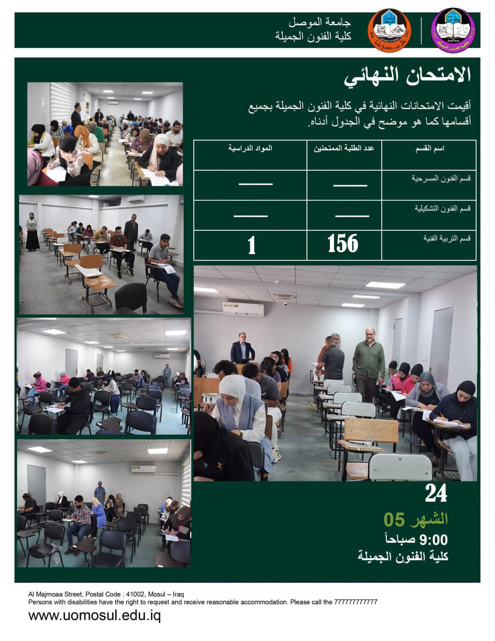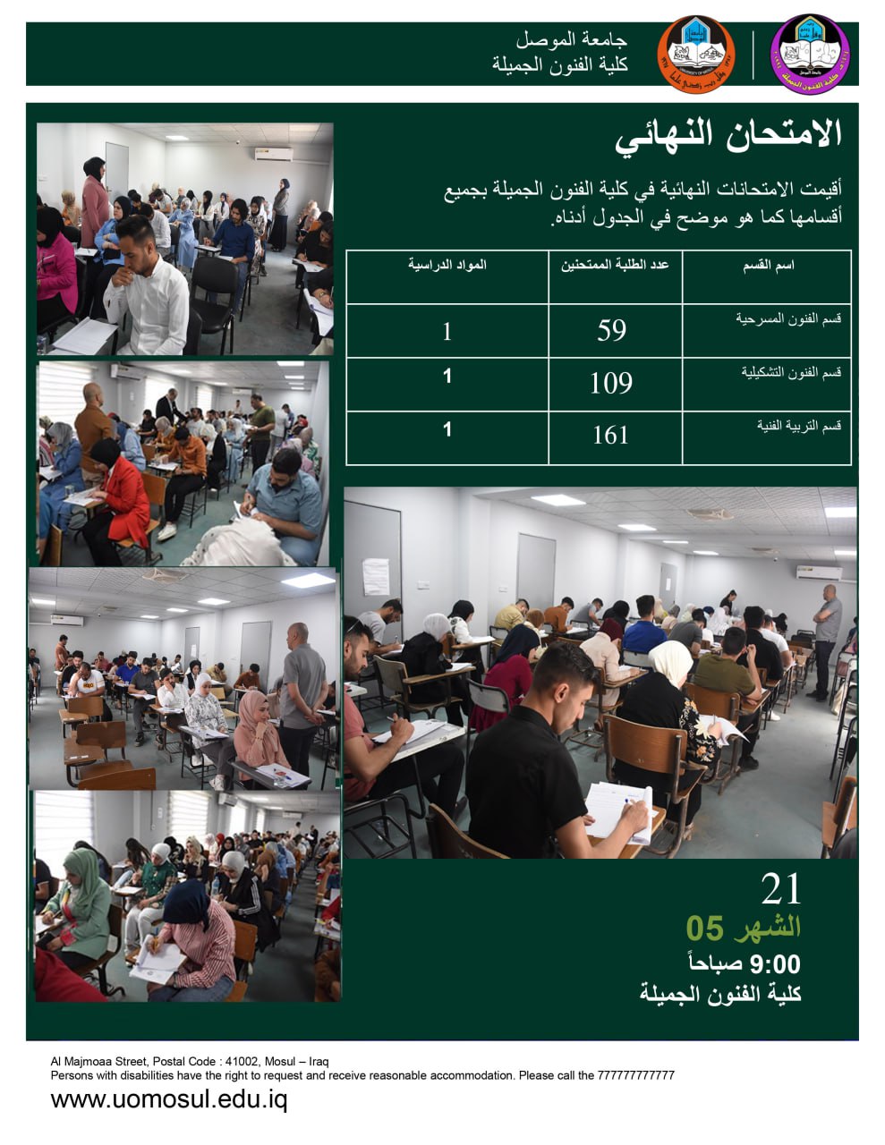 تعلن عمادة كلية الفنون الجميلة عن جداول الامتحانات النهائية لطلبة المرحلة الاولى ولكافة الاقسام للعام الدراسي ٢٠٢٤-٢٠٢٥ للدراستين (الصباحية والمسائية) وكما مبين بالجداول المرفقة مع [إقرأ المزيد]