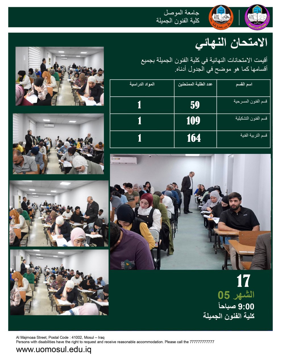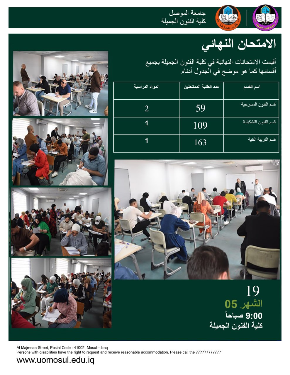 باشرت كلية الفنون الجميلة اليوم الاحد ٤ ايار ٢٠٢٥ بإجراء الامتحانات النهائية لطلبة الدراسات الاولية الصباحية والمسائية للعام الدراسي ٢٠٢٤ - ٢٠٢٥ ولكافة الاقسام. وقد تفقد [إقرأ المزيد]