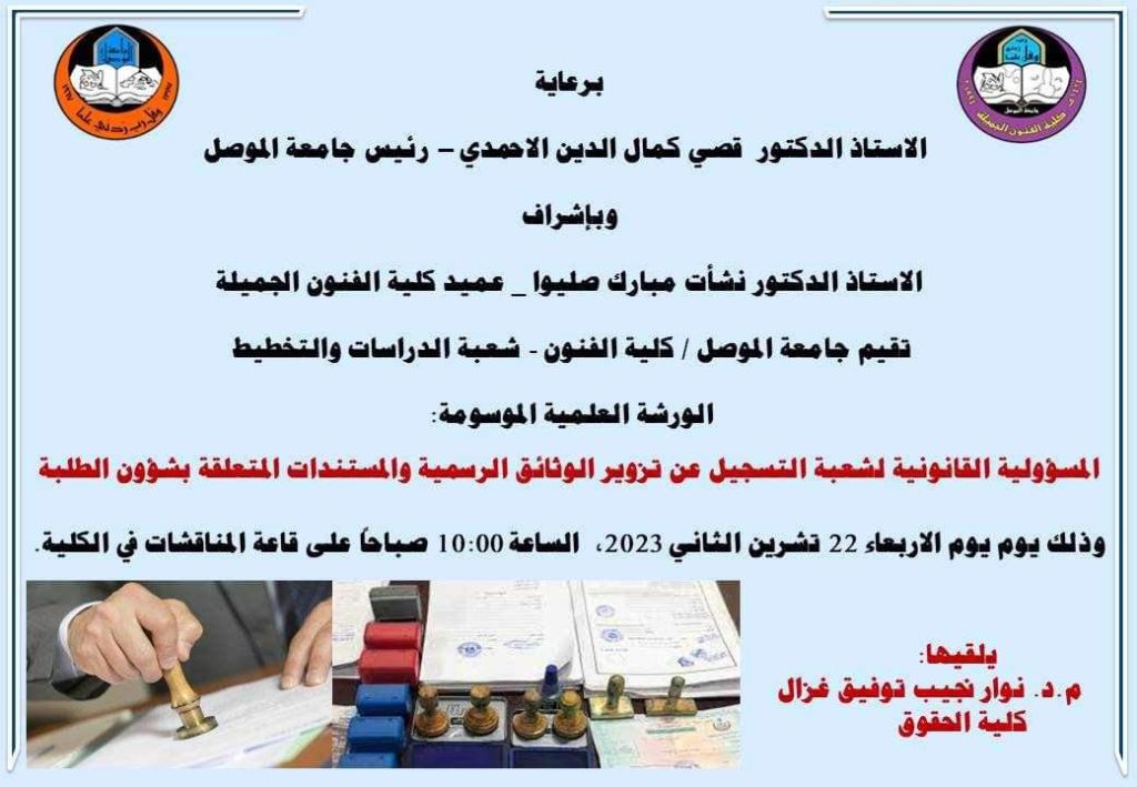 بإشراف وحضور السيد عميد كلية الفنون الجميلة الأستاذ الدكتور نشأت مبارك صليوا ومعاونه العلمي اقامت شعبة الدراسات والتخطيط الورشة العلمية الموسومة المسؤولية القانونية لشعبة التسجيل عن تزوير الوثائق الرسمية والمستندات المتعلقة بشؤون الطلبة وبالتعاون مع وحدة التعليم المستمر يوم الاربعاء الموافق ٢٢ تشرين الثاني ٢٠٢٣ حاضر فيها الدكتور نوار نجيب توفيق غزال.