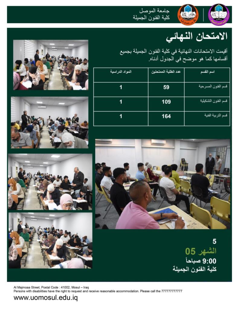 باشرت كلية الفنون الجميلة اليوم الاحد ٤ ايار ٢٠٢٥ بإجراء الامتحانات النهائية لطلبة الدراسات الاولية الصباحية والمسائية للعام الدراسي ٢٠٢٤ – ٢٠٢٥ ولكافة الاقسام.