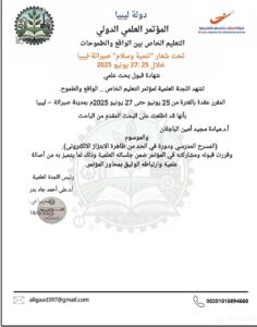 في إطار تعزيز الانفتاح الأكاديمي والتواصل العلمي بين الجامعات العراقية ونظيراتها العربية والدولية، شاركت الأستاذ الدكتورة ميادة مجيد أمين الباجلان، التدريسية في قسم التربية الفنية – كلية الفنون الجميلة ، في أعمال المؤتمر العلمي الإلكتروني بعنوان”التعليم الخاص: الواقع والطموحات”الذي أُقيم في مدينة صبراتة – ليبيا للفترة من 25 إلى 27 حزيران 2025، تحت شعار “تنمية وسلام”.