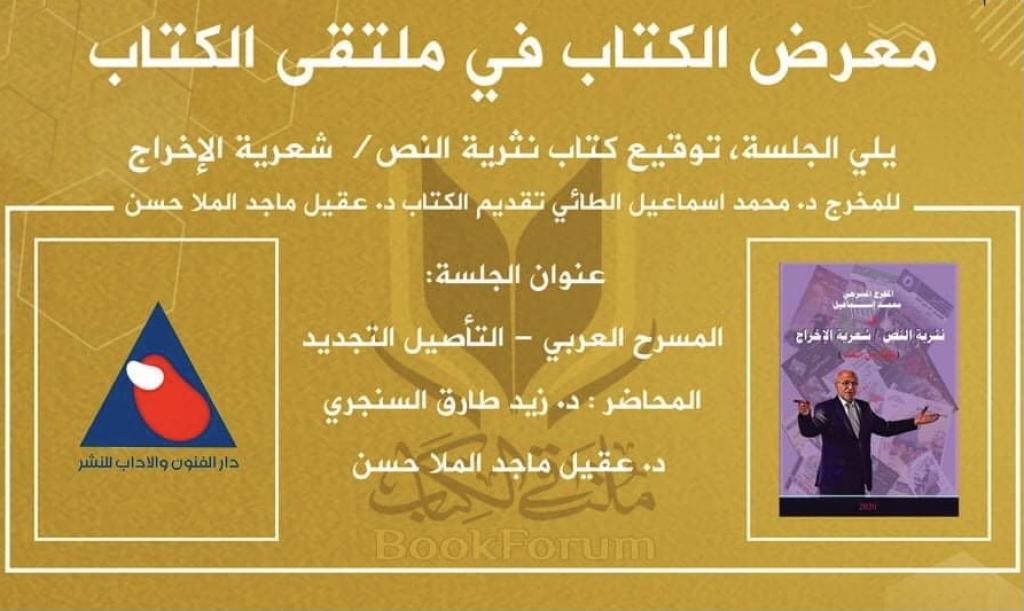 ضمن توجهات رئاسة جامعة الموصل بالانفتاح على المجتمع استضاف ملتقى الكتاب وضمن فعاليات مهرجان الكتاب الاول المقام للفترة من 22 – 31 تشرين الاول 2020 كل من الدكتور محمد اسماعيل الطائي وحفل توقيع كتابه (نثرية النص / شعرية الاخراج) والدكتور زيد طارق السنجري لتقديم محاضرة بعنوان ( المسرح العربي – التأصيل التجديد) والدكتور عقيل ماجد حامد لادارة حفل توقيع الكتاب وتسيير المحاضرة ، وقد حضر الاحتفالية نخبة من اساتذة جامعة الموصل وجمع من المثقفين والمهتمين بالشأن المسرحي، وتأتي هذه الانشطة بين اساتذة الجامعة وبين المؤسسات الفنية والادارية في المحافظة لتبادل الاراء والخبرات .
