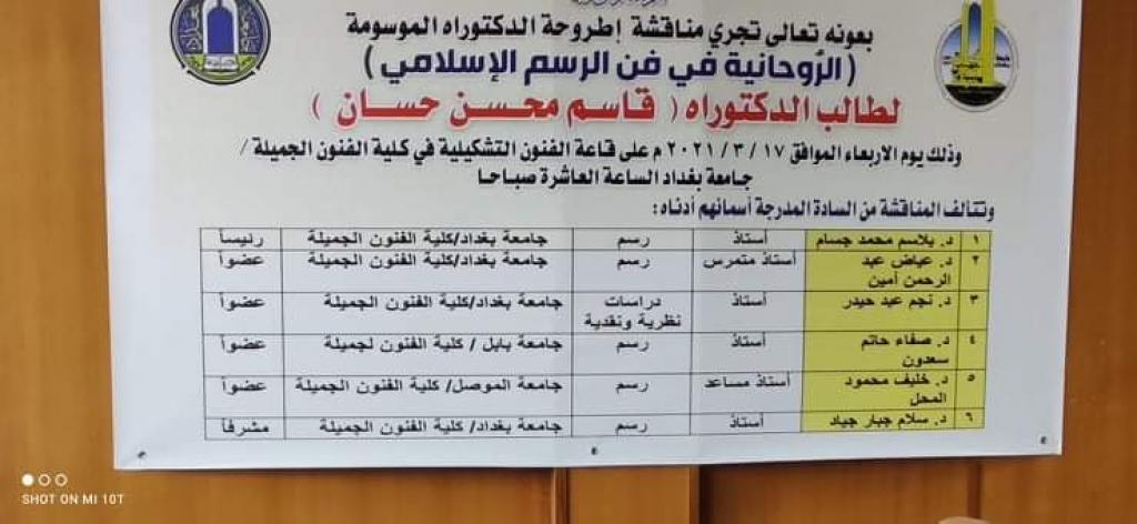 شارك الاستاذ المساعد الدكتور خليف محمود المحل التدريسي في كلية الفنون الجميلة / جامعة الموصل يوم الاربعاء الموافق ١٧ آذار ٢٠٢١ عضوا في لجنة مناقشة اطروحة الدكتوراه الموسومة ( الروحانية في فن الرسم الاسلامي) لطالب الدكتوراه قاسم محسن حسان علىقاعة الفنون التشكيلية في كلية الفنون الجميلة / جامعة بغداد وتألفت لجنة المناقشة من السادة١. أ.د. بلاسم محمد جسام٢. أ.د. عياض عبد الرحمن امين٣. أ.د. نجم عبد حيدر٤. أ.د. صفاء حاتم سعدون٥. أ.م.د. خليف محمود المحل٦ .أ.د. سلام جبار جياد