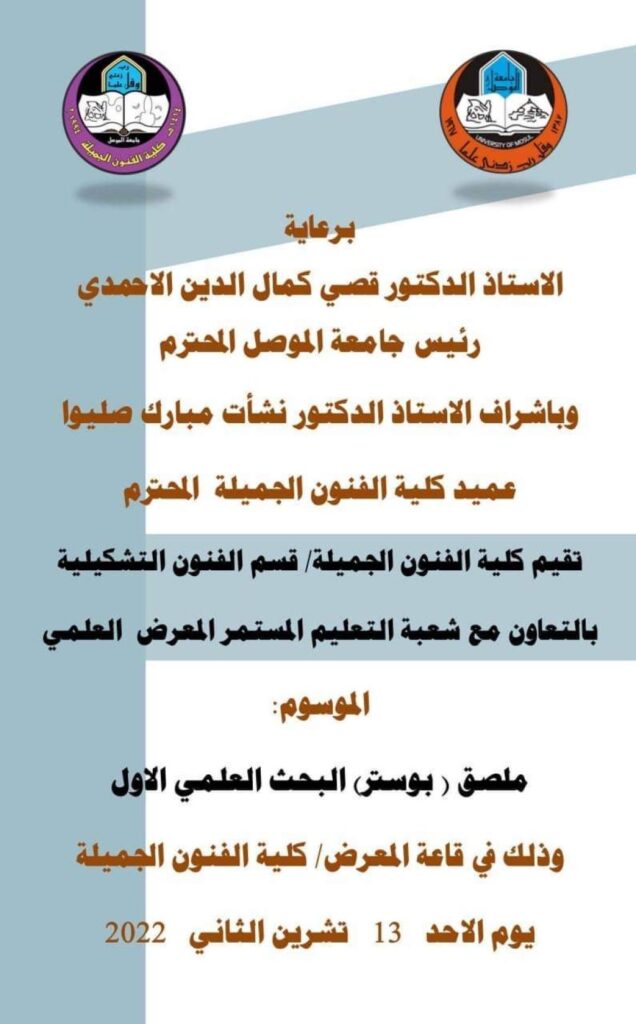 بإشراف الدكتور نشأت مبارك صليوا عميد كلية الفنون الجميلة وبمتابعة الدكتور زيد طارق فاضل مسؤول وحدة التعليم المستمر اقامت كلية الفنون الجميلة دورة (الطرق على الجلود) بالتعاون مع الجامعة التقنية الشمالية وفي قاعة الاشغال اليدوية لقسم التربية الفنية.