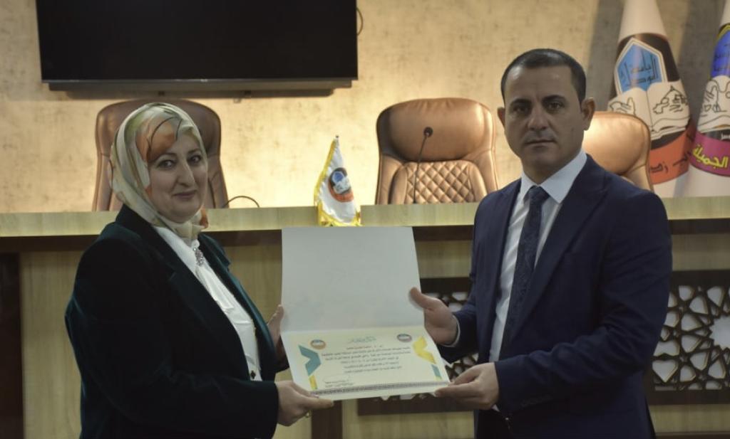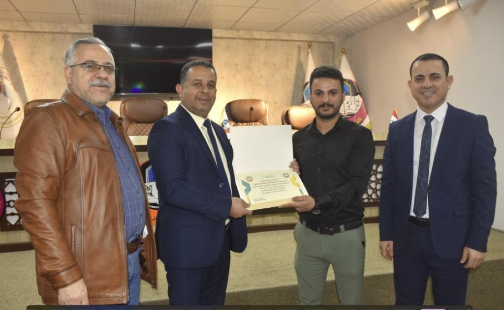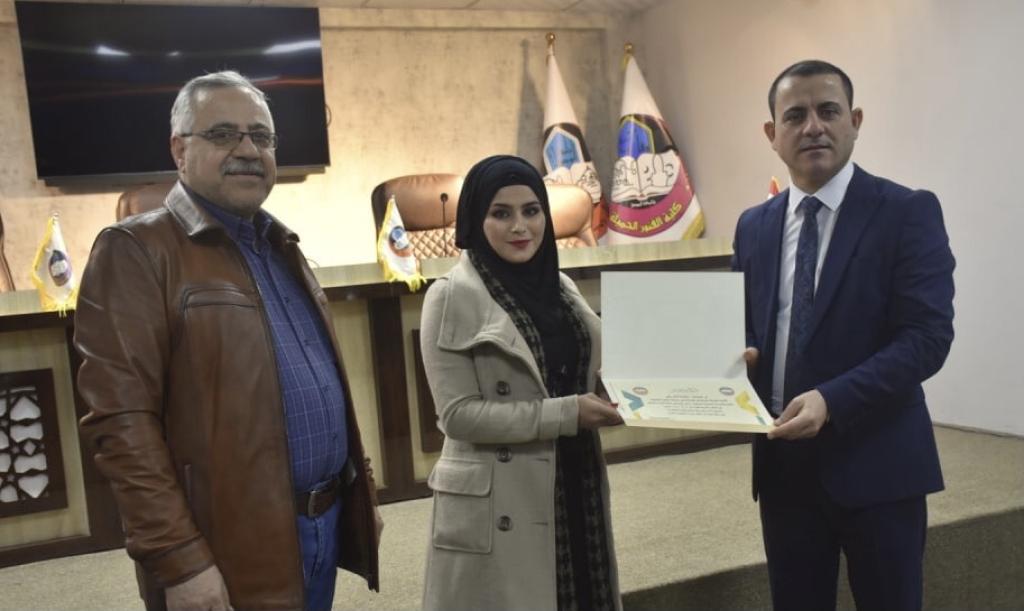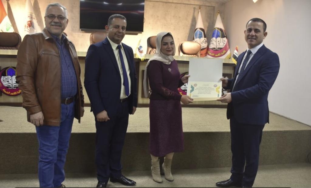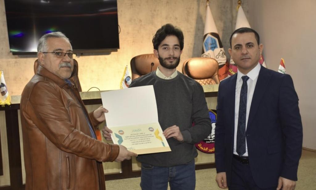 بحضور الاستاذ الدكتور نشأت مبارك صليوا عميد كلية الفنون الجميلة ومعاونيه العلمي والاداري تم تكريم وفد الكلية المشارك في مسابقة الفنون التشكيلية لطلبة وطالبات الجامعات العراقية في جامعة الفرات الاوسط / النجف الاشرف ، والذي ضم كل من التدريسية مائدة طارق والطالبة فاطمة ثائر علي والطالبة عائشة عبد الستار عبدالله والطالب حسن صباح حسن والطالب ايمن محمود يونس بشهادات تقديرية تثميناً لجهودهم ومشاركتهم في المهرجان السنوي السابع لوزارة التعليم العالي للنشاطات الطلابية الذي أقيم في جامعة الفرات الأوسط التقنية .واثنى السيد عميد الكلية على الجهود المبذولة في هذه المشاركة املاً المزيد من العطاء ومتمنياً للجميع الموفقية والنجاح .شعبة إعلام كلية الفنون الجميلة