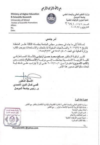 يسر عمادة كلية الفنون الجميلة ان تتقدم بأسمى التهاني والتبريكات لحصول الدكتور صالح محمد حسن ارديني وكيل عميد كلية الفنون الجميلة – جامعة الموصل على لقب الاستاذية بعد مصادقة وزارة التعليم العالي والبحث العلمي على محضر مجلس جامعة الموصل بجلسته الثالثة عشر المنعقدة بتاريخ 5/2/2019 على ترقيته إلى مرتبة الأستاذية متمنين له المزيد من التقدم والموفقية رفدا للمسيرة العلمية وخدمة لبلدنا العزيز.