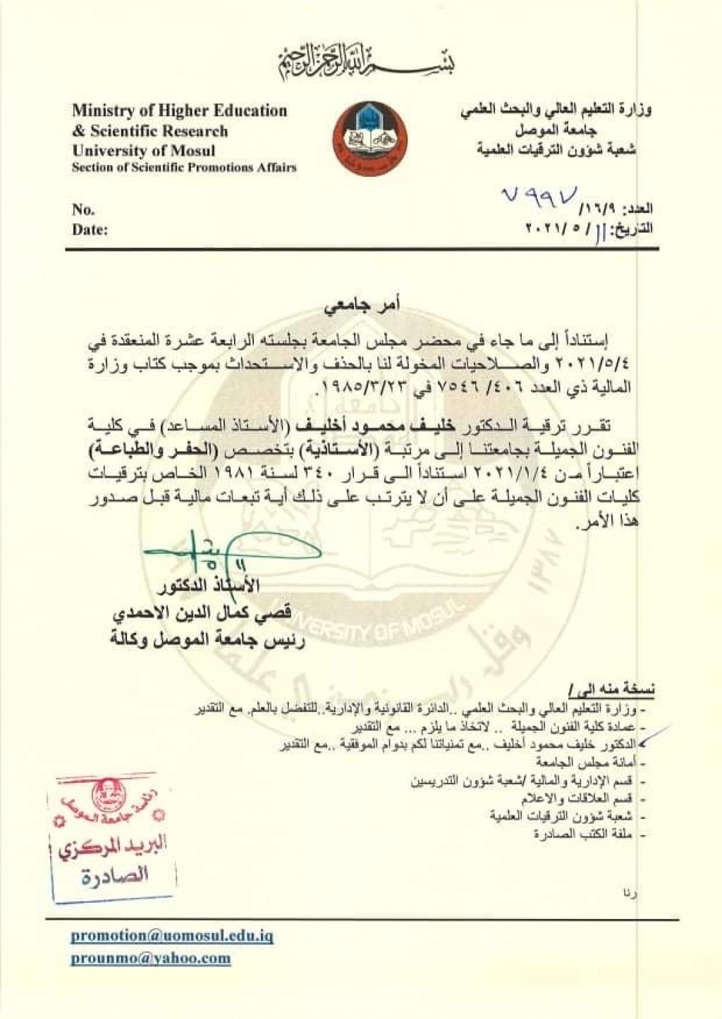 تتقدم عمادة كلية الفنون الجميلة متمثلة بالاستاذ المساعد الدكتور نشأت مبارك صليوا بأجمل التهاني والتبريكات الى الاستاذ الدكتور خليف محمود بمناسبة الترقية العلمية وحصوله على مرتبة الاستاذية متمنين له دوام التوفيق والنجاح والتميز في المسيرة العلمية خدمة لعراقنا الحبيب.