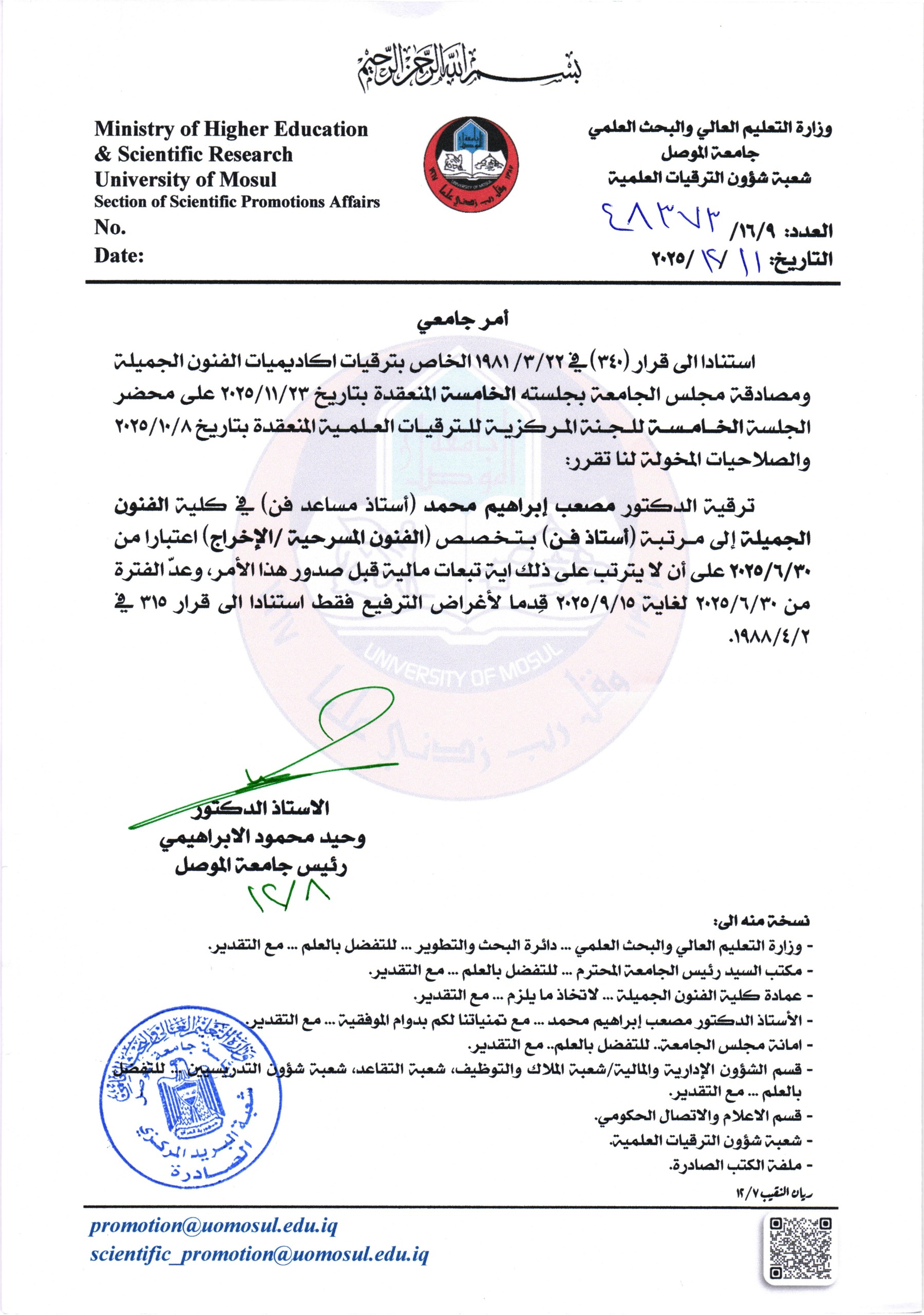 تتقدم عمادة كلية الفنون الجميلة متمثلة بالاستاذ الدكتور حامد ابراهيم الراشدي بأجمل التهاني والتبريكات الى الدكتور مصعب ابراهيم محمد بمناسبة الترقية العلمية وحصوله على مرتبة الاستاذية متمنين له دوام التوفيق والنجاح والتميز في المسيرة العلمية خدمة لعراقنا الحبيب.