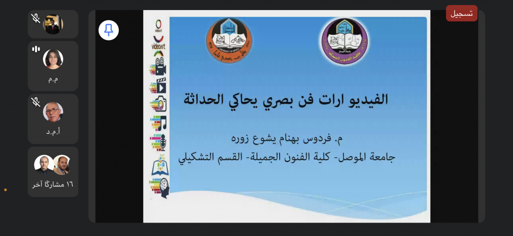 ضمن سلسلة الحلقات النقاشية التي تعقدها كلية الفنون الجميلة اقام قسم الفنون التشكيلية حلقة نقاشية مساء يوم السبت الموافق ٢٧ اذار ٢٠٢١ بعنوان ( الفيديو ارت فن بصري يحاكي الحداثة) تقديم م. فردوس بهنام يشوع الكترونيا عبر منصة meet يديرها م. ياسر ابراهيم حمادي بحضور عدد من تدريسي الاقسام .