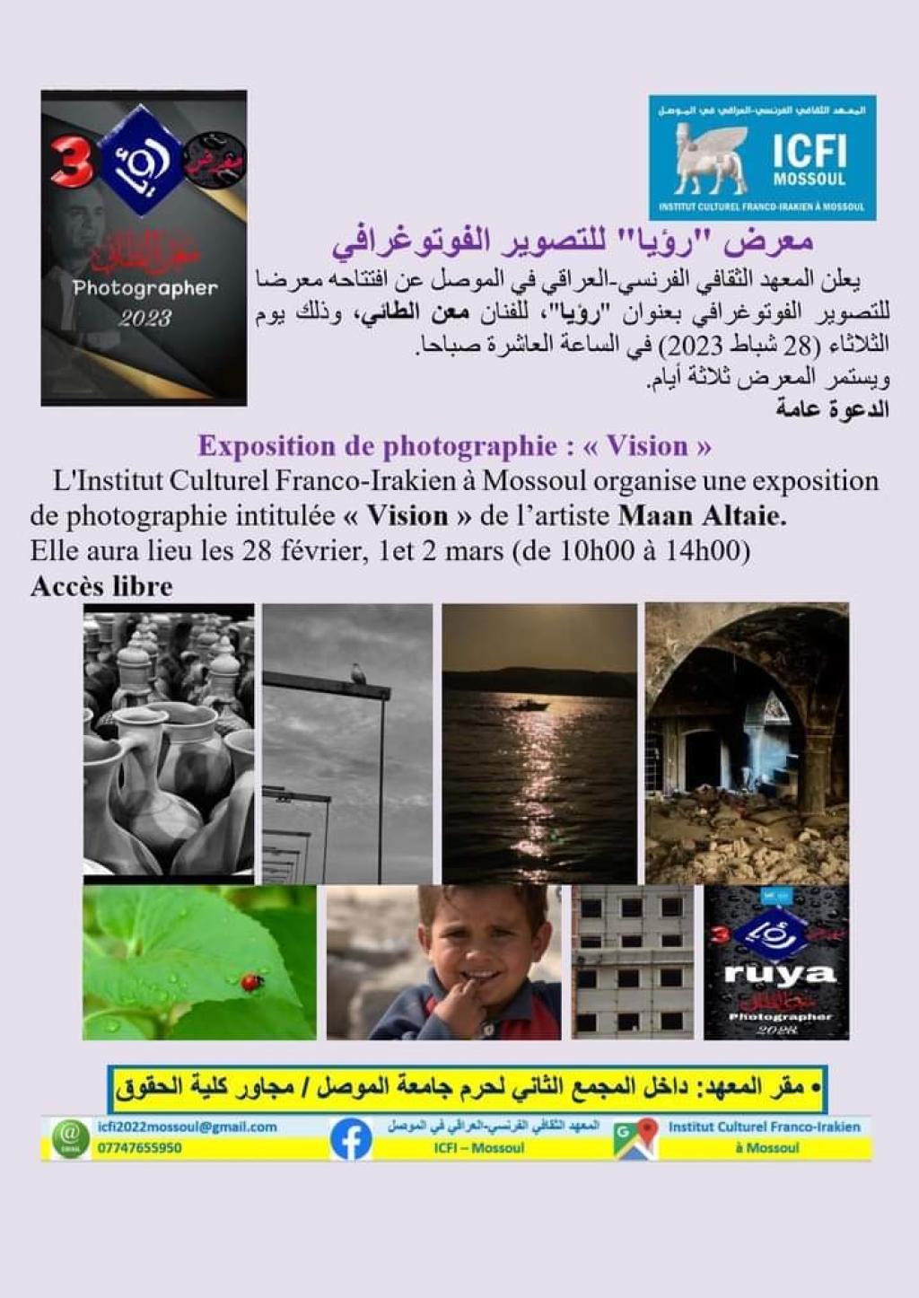 بحضور الاستاذ الدكتور نشأت مبارك صليوا عميد كلية الفنون الجميلة والاستاذ المساعد الدكتور وسام نعمت ابراهيم عميد كلية الحقوق وعدد من اساتذة الجامعة وفنانين واكاديميين تم افتتاح المعرض الشخصي الثالث للمصور الفوتوغرافي معن الطائي بعنوان (رؤيا) والذي اقيم في المعهد الثقافي الفرنسي -العراقي في جامعة الموصل ( المجمع الثاني ) يوم الثلاثاء الموافق ٢٨ شباط ٢٠٢٣.ضم المعرض ٣٠ صورة فوتوغرافية بأحجام مختلفة وموضوعات مختلفة اقتنصها الفنان معن الطائي داخل العراق فضلاً عن صور فوتوغرافية تحاكي بيئات ومواضيع مختلفة خارج العراق .شعبة إعلام كلية الفنون