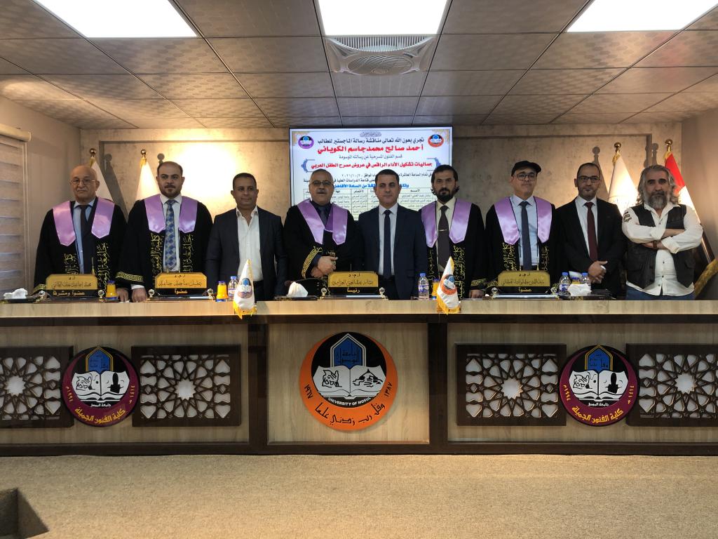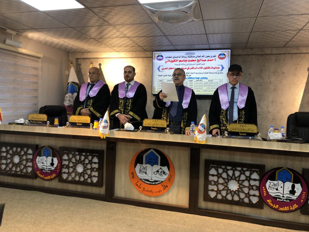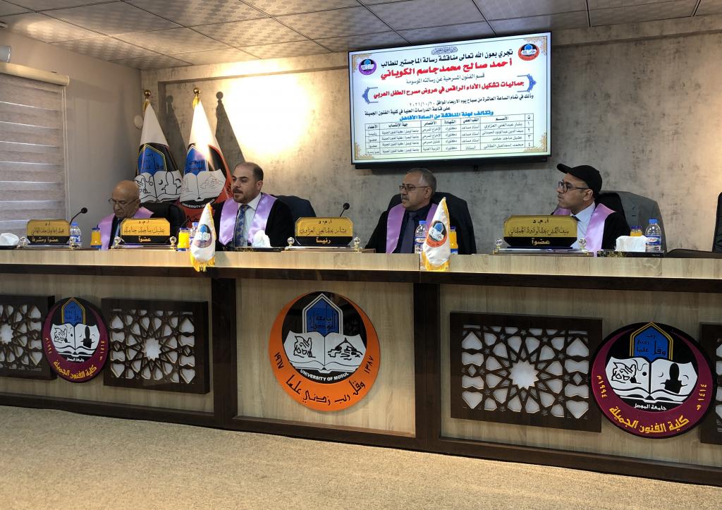 استمرارً لحركة البحث العلمي في جامعة الموصل ناقشت كلية الفنون الجميلة رسالة الماجستير الموسومة ( جماليات تشكيل الاداء الراقص في عروض مسرح الطفل العربي ) صباح يوم الاربعاء الموافق ٢٠ تشرين الاول ٢٠٢١ على قاعة الدراسات العليا في كلية الفنون الجميلة .