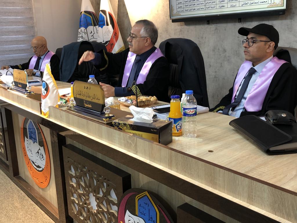وقد ترأس لجنة المناقشة الأستاذ المساعد الدكتور بشار عبدالغني محمد من جامعة الموصل / كلية الفنون الجميلة وعضوية كل من الأستاذ المساعد الدكتور سيف الدين عبدالودود من جامعة البصرة / كلية الفنون الجميلة والاستاذ المساعد الدكتور عقيل ماجد حامد من جامعة الموصل / كلية الفنون الجميلة وبإشراف وعضوية الأستاذ الدكتور محمد اسماعيل خلف من جامعة الموصل / كلية الفنون الجميلة.