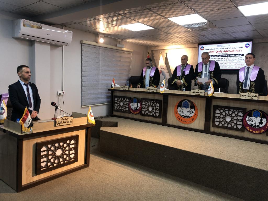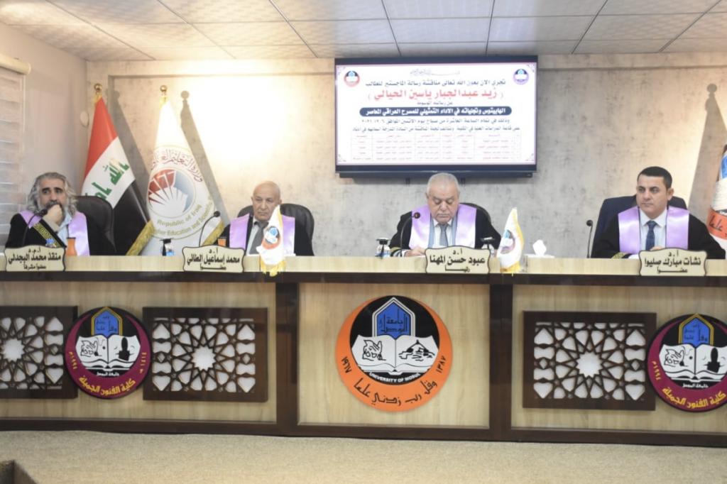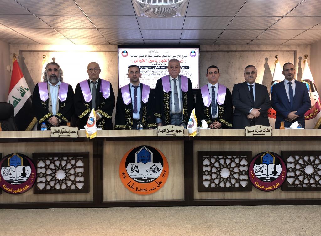 وقد ترأس لجنة المناقشة الأستاذ الدكتور عبود حسن المهنا من جامعة بابل / كلية الفنون الجميلة وعضوية كل من الأستاذ الدكتور نشأت مبارك صليوا من جامعة الموصل / كلية الفنون الجميلة والاستاذ الدكتور محمد اسماعيل خلف من جامعة الموصل / كلية الفنون الجميلة وبإشراف وعضوية الأستاذ المساعد الدكتور منقذ محمد فيصل من جامعة الموصل / كلية الفنون الجميلة.
