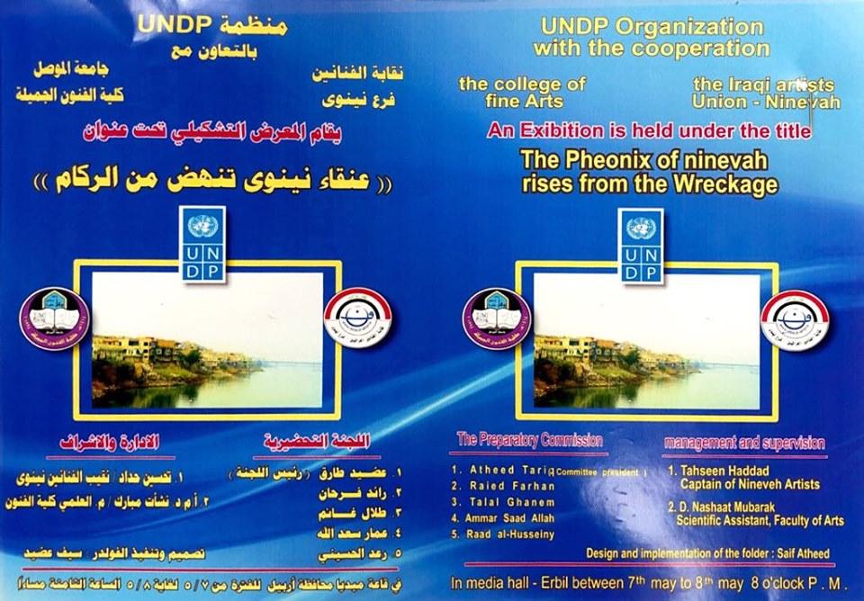 اقامت منظمةUNDPبالتعاون مع كلية الفنون الجميلة – جامعة الموصل ونقابة الفنانين العراقيين – فرع نينوى معرضاً فنيا بعنوان (عنقاء نينوى تنهض من الركام) في قاعة ميديا – اربيل , حضره العديد من الجهات الرسمية وفنانين واعلاميين ومثقفين والمهتمين بالفن التشكيلي , وضم المعرض قاعتين كبيرين للوحات فنية لعدد من الفنانين والمشاركين في المعرض الى جانب تدريسي وموظفي وطلبة كلية الفنون الجميلة , والقى كلمة الافتتاح ممثل رئيس جامعة الموصل الاستاذ الدكتور صالح محمد ارديني , تلاها كلمة عضو لجنة الادارة والإشراف الدكتور نشأت مبارك صليوا , ثمنوا فيها دور منظمة UNDPفي دعم الحركة الفنية في محافظة نينوى لتنهض من جديد من ركام الفترة المظلمة التي مرت بها سابقاً