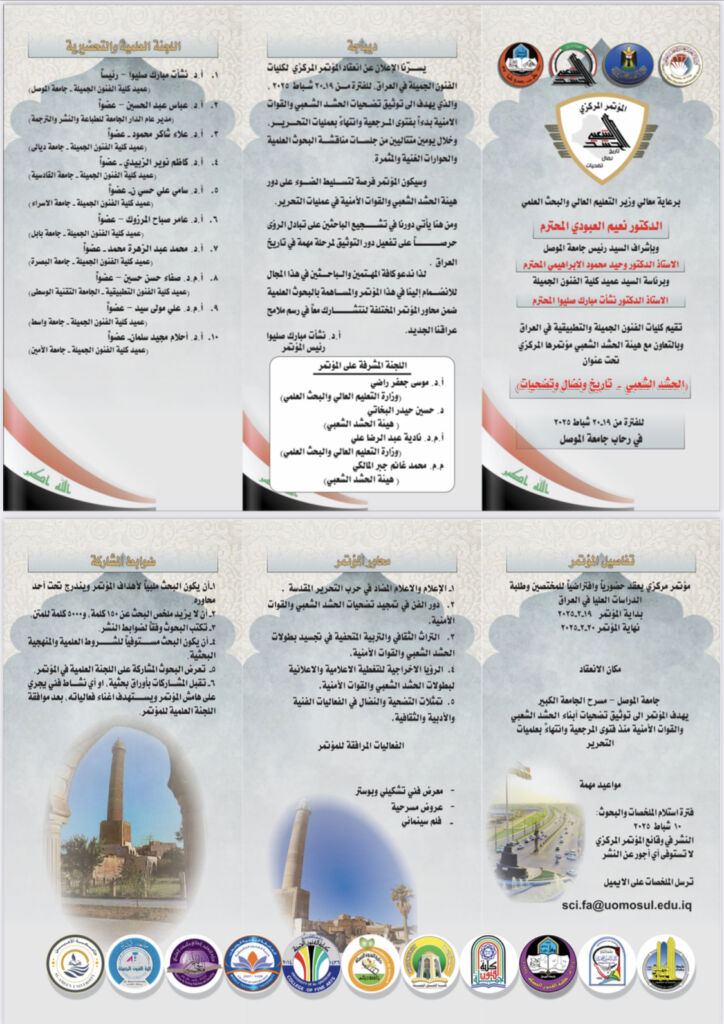 افتتح السيد عميد كلية الفنون الجميلة في جامعة الموصل وبحضور معاونيه العلمي والاداري ونخب أكاديمية وفنية وثقافية المعرض الشخصي للطالب مصطفى عبدالناصر اسماعيل (عودة الحدباء) اليوم الاثنين ٣ شباط ٢٠٢٥.